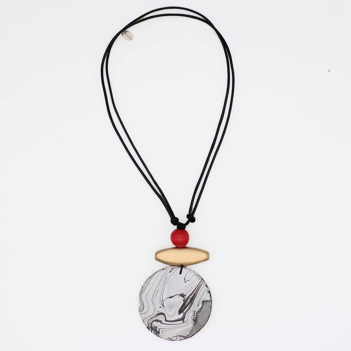 Aria Gold Black Red Bold Circle Statement Necklace – Make a bold geometric statement with this stunning handcrafted necklace featuring striking circle-shaped wooden beads in lustrous gold, classic black, and vibrant red on an adjustable wax cord. This eye-catching piece combines modern design with organic beauty, creating a unique accessory that brings sophisticated drama to any outfit. Why You'll Love It: * Bold geometric circle design creates striking visual interest and modern appeal * Lustrous gold, black, and red color palette adds sophisticated glamour with dramatic contrast * Adjustable wax cord length (22-32") allows you to customize the perfect fit for any neckline * Surprisingly lightweight wooden beads ensure all-day comfort * Handcrafted quality with premium wood materials for lasting beauty * Versatile statement piece that transitions from casual to contemporary occasions Product Details: * Length: Adjustable 22-32 inches * Materials: Premium wood circle beads on adjustable wax cord * Colors: Gold, black, and red * Style: Geometric circle statement necklace * Weight: 2 oz (lightweight) * SKU: BP25N38 RED Care Instructions: * Wipe gently with a soft, dry cloth to maintain luster * Avoid exposure to water, perfumes, and harsh chemicals * Store in a cool, dry place away from direct sunlight * Handle with care to preserve the natural beauty of the wood beads and metallic finish