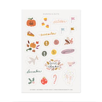 Pumpkins, sweaters, cozy socks and tea are my vibe everyday. If they are your vibe too, you'll love these little stickers. Perfect for journals, planners, memory keeping and more. 24+ stickers per sheet. Details: • Matte weatherproof paper stickers on backing sheet • Ink is water resistant but stickers are not dishwasher/outdoor waterproof • Size: approx. 3.5 x 6.5 inches • No AI. Listing is for one sheet of stickers, all other items are not included in this listing.