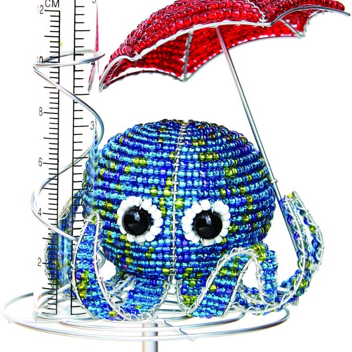 * 5 x 5 x 9 * Includes 2 Pieces * Stake is 31"H * Gauge cylinder is glass * Rain Gauge can measure up to 5" * Hand sculpted and beaded * Beads are high quality non fading or cracking glass and acrylic * Piece resist rust and corrosion, great inside or out * Affordable work of art * All dimensions are in inches  Beadworx Rain Gauges are a great way to measure rain over a period of time to ensure the proper watering of plants. They are sure to bring fun to any garden