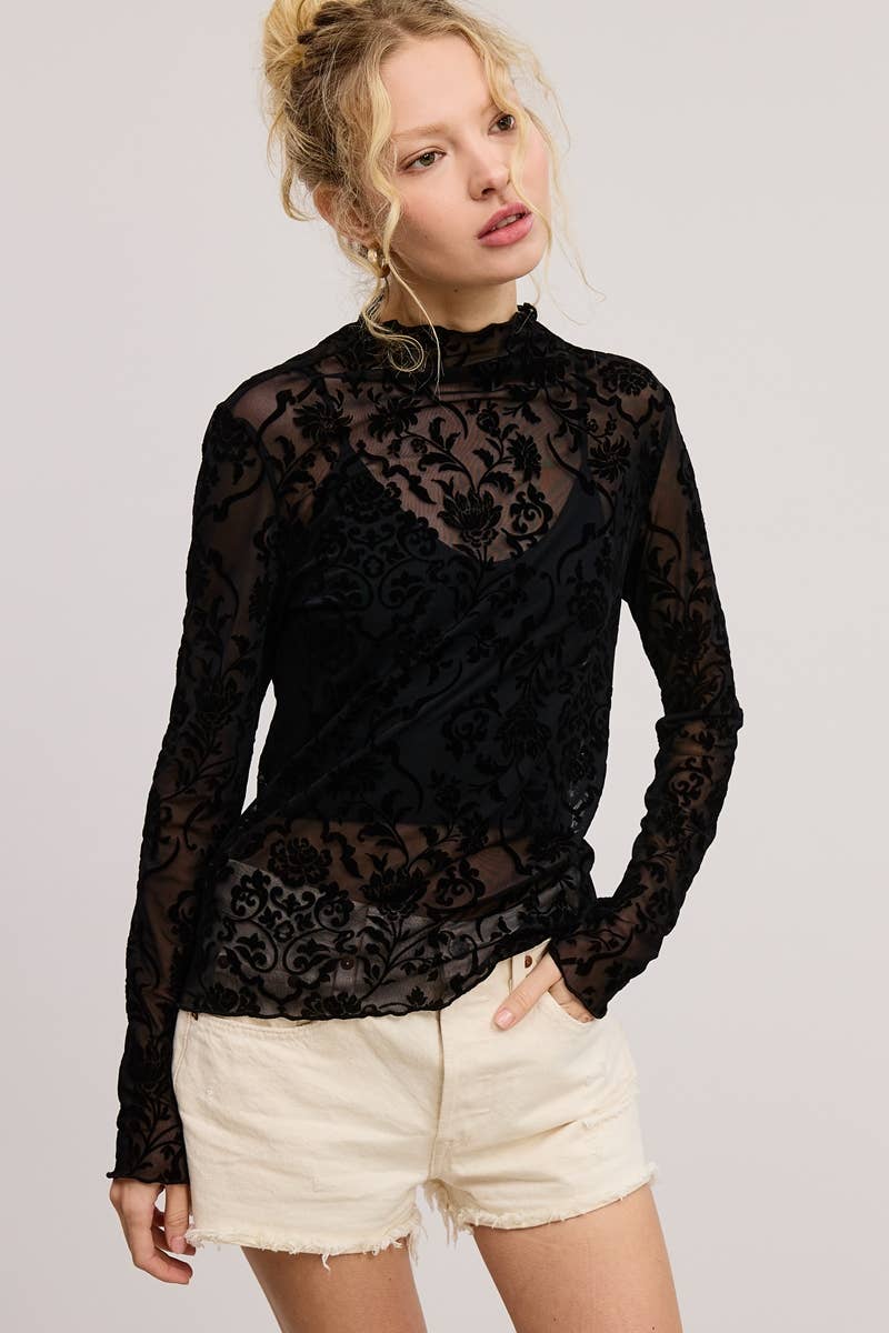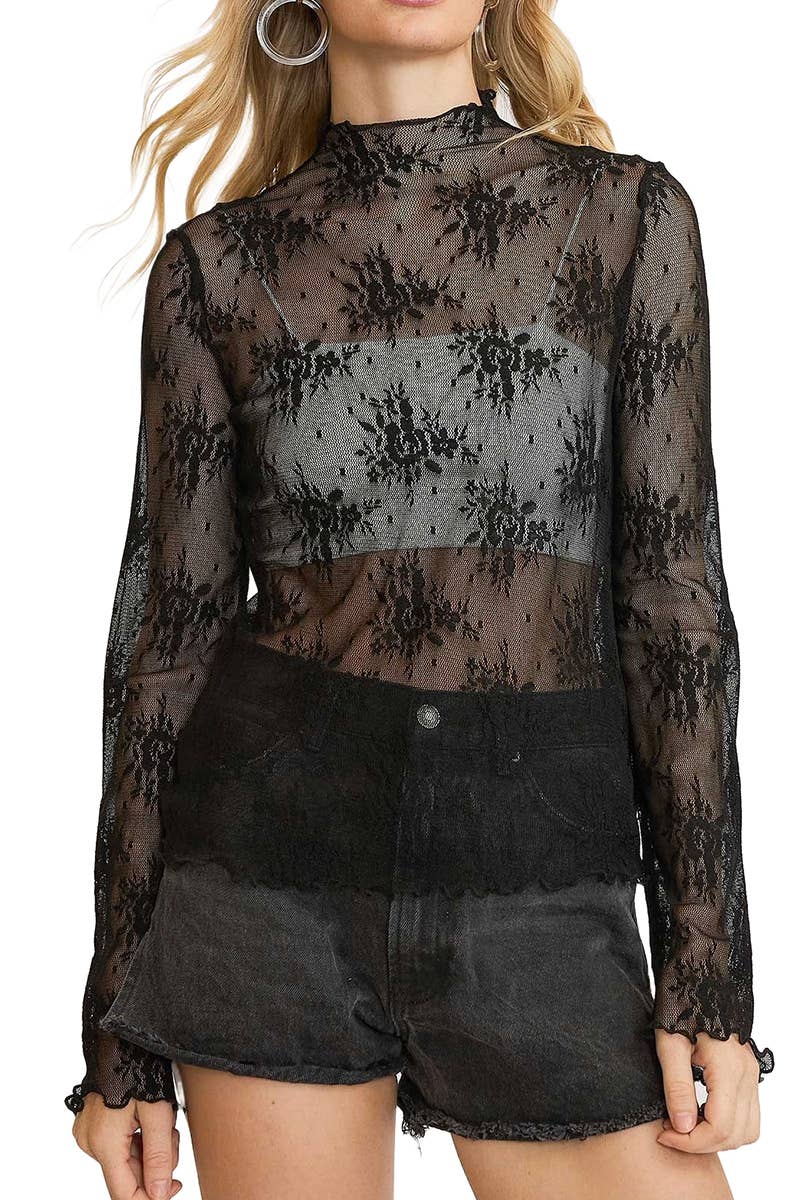 Crafted from a lightweight nylon-poly blend, this lace top is designed for effortless layering across all seasons. The intricate merrow edge detailing along the hem and sleeves adds a refined touch, making it a standout piece in any wardrobe. Its breathable, sheer lace fabric ensures both comfort and style, whether worn under a jacket in cooler months or as a light, airy layer during warmer days. Please note, this top is unlined and does not include any underwear, allowing for versatile styling options. It's perfect for creating a custom look by layering with preferred camisole or bralette, offering endless possibilities to mix and match.