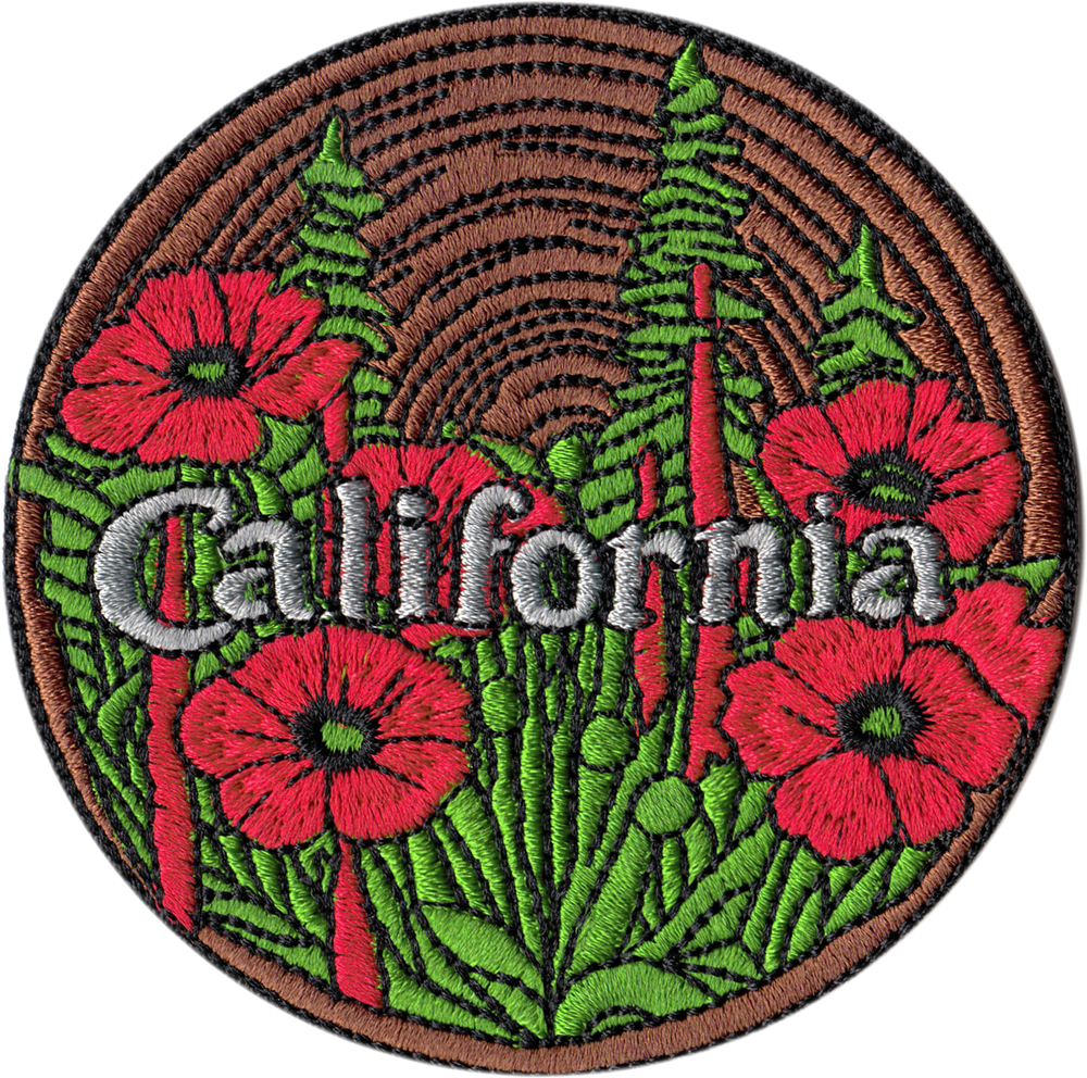 California Poppy Embroidered Iron-On Patch Celebrate the beauty of the Golden State with this vibrant California patch featuring bright orange poppies, the state flower. The intricate embroidery and elegant script make it a standout piece for any collection. This 3-inch round iron-on patch is cut to shape and perfect for jackets, backpacks, hats, or crafting projects. A must-have for fans of floral designs and California pride.