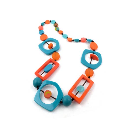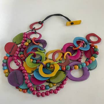 This is our all-time best seller: A fabulous composition of concentric circled-shaped tagua beads combined with Acai seeds, making up a playful combination of shape and color. A cute tagua button in the back for closure (measures 26” from tip to tip). . Each circular bead was shaped from vegetable ivory (Tagua seeds) and dyed. This multicolor tagua nut necklace is a chic and uncommon accessory that goes well with any outfit. All the beads used are sustainable, organic and vegan: 100% vegetable ivory (Tagua seeds). This tagua necklace is fair trade and ethically handmade in Colombia, Muichic Natural Jewelry is a proud member of the Fair Trade Federation.