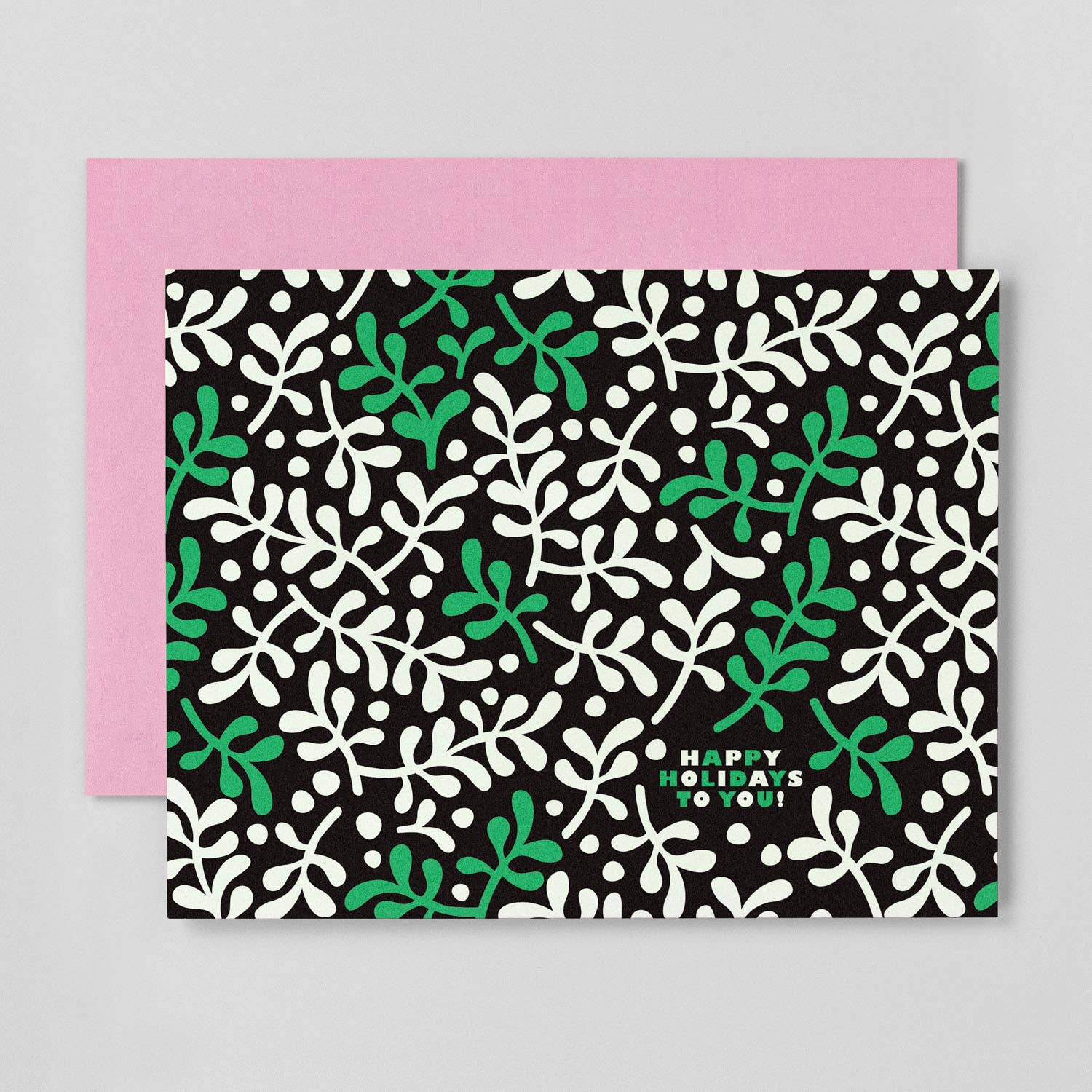 "Happy Holidays To You!" abstract mistletoe pattern holiday card boxed set of 8 folded cards. • Blank inside • A2 (4.25" x 5.5") • 100# FSC-certified paper • Comes with a color-coordinated envelope • Packaged in a clear box with branded sticker • Flat-printed • Printed in the USA