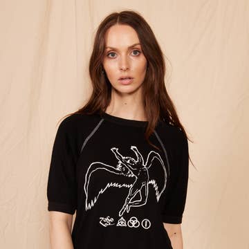 On the Temperance card, there is an angel with wings, whose gender is not immediately obvious, which suggests that there is a balance between the sexes. She holds two cups in a manner where she can mix the waters, which represent the super and subconscious minds. The water flows between them, suggesting union and infinity. Everything about this card represents balance, the perfect harmony that comes from the union of dualities. Her advice is to test any new waters, before jumping into the deep end. -Labyrinthos https://tinyurl.com/bs3vrtxd My illustration of Temperance is screen-printed in Ontario on soft 100% cotton unisex t-shirts. Fit is a bit boxy and oversized. Model wears a size S.