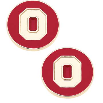Silver plated stud earrings with red, white and black enamel featuring the Ohio State logo. Logo measures around 0.5” in height. This is an officially licensed product.