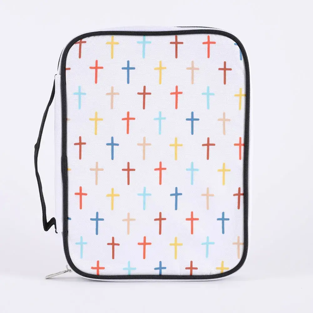 This Black Fabric Bible Cover Has A Sturdy 600 Denier Canvas-Look Polyester With Nylon Reinforced Stitching. Non-Rusting And Self-Repairing Side Zipper. Carrying Handle At Side. Cover Lays Completely Flat When Open; Inside Is A Loop For Your Pen And An Attached Ribbon Bookmark. The Large Size Holds A Bible Or Book Up To About 7-1/8 x 2 x 10-1/4. A White-Outlined Set Of 3 Orange Crosses Adorns The Front Cover.