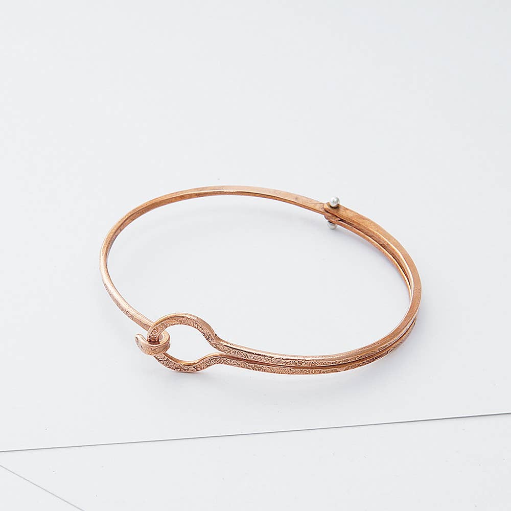 Sterling silver. 2 1/2" width. Textured silver with pin accents. Each mark and groove hammered by hand and finished with a time-worn patina.