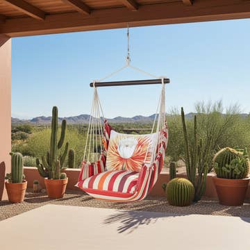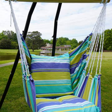 Handcrafted hammock swing set perfect for relaxing on a patio, porch or living room. Each set includes: swing with a 33" wood bar, 24x24" bottom stuffed pillow, 19x24" back stuffed pillow and tote bag. Made in El Salvador of sundure polyester that feels like cotton and pine wood. For use indoors and outdoors. Weight capacity: 250 pounds