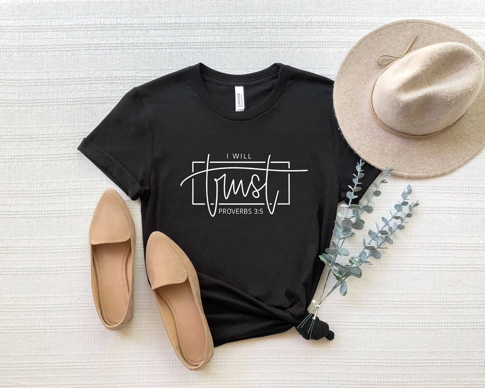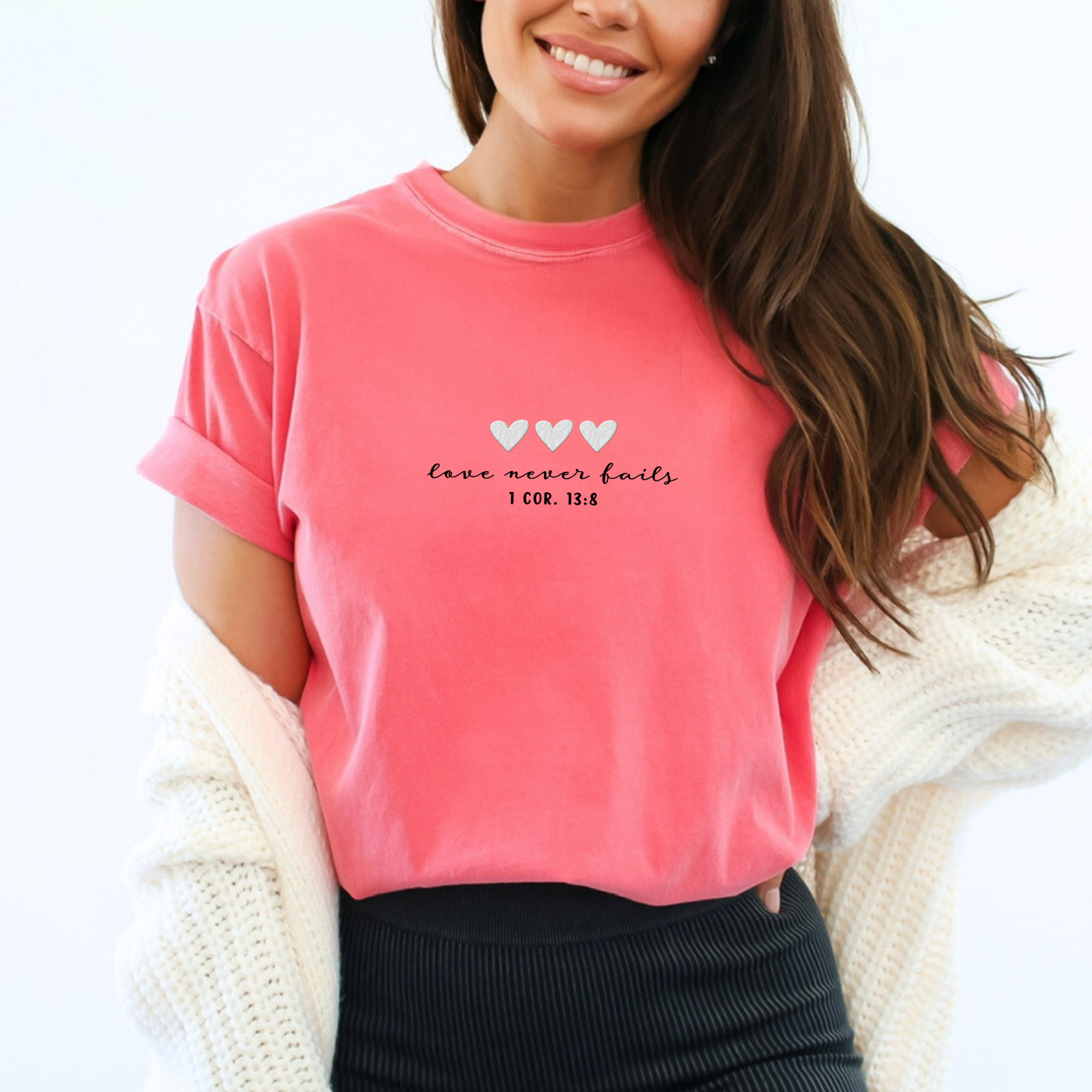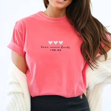 "I'm never alone He'll never forsake me" Hebrews 15:3 This classic unisex t-shirt fits like a well-loved favorite, featuring a peach color, classic crew neck, short sleeves and superior blend of heirloom combed and ring-spun cotton and polyester. We design our jewelry and apparel to bless others in a personal way, and in return we are being a blessing to those in need by donating a portion of the proceeds from our sales to local and international missions. Sizing and Specifications: 52% Cotton 48% Poly Short sleeved Ribbed crew neck Printed at our facilities in Georgia, USA Fit: Unisex runs true to size (see attached sizing guide). Sizes: Small thru XX-Large Care Instructions: Machine wash cold, inside out, with like colors. Only non-chlorine bleach. Tumble dry low. Medium/hot iron. Do not iron decoration. Do not dry clean.