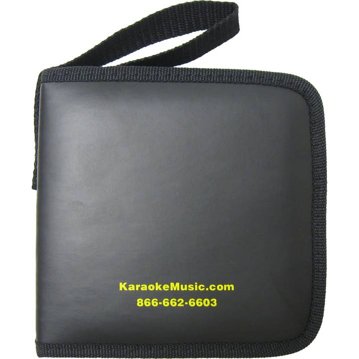 These are 24 disc capacity CD / DVD carry cases. The binders are solid black and feature a nylon zippered closure. Each binder has twelve black sewn-in pages that can hold 2 discs each. The edges of the case are bordered with nylon. The case features a nylon carry strap that makes this great for transporting. The binder measures 5.875" x 6.0625" x 1.75". The case has "KaraokeMusic.com" and a phone number on the front of it. 24 capacity cases are ideal for taking your favorite discs with you on the go!
