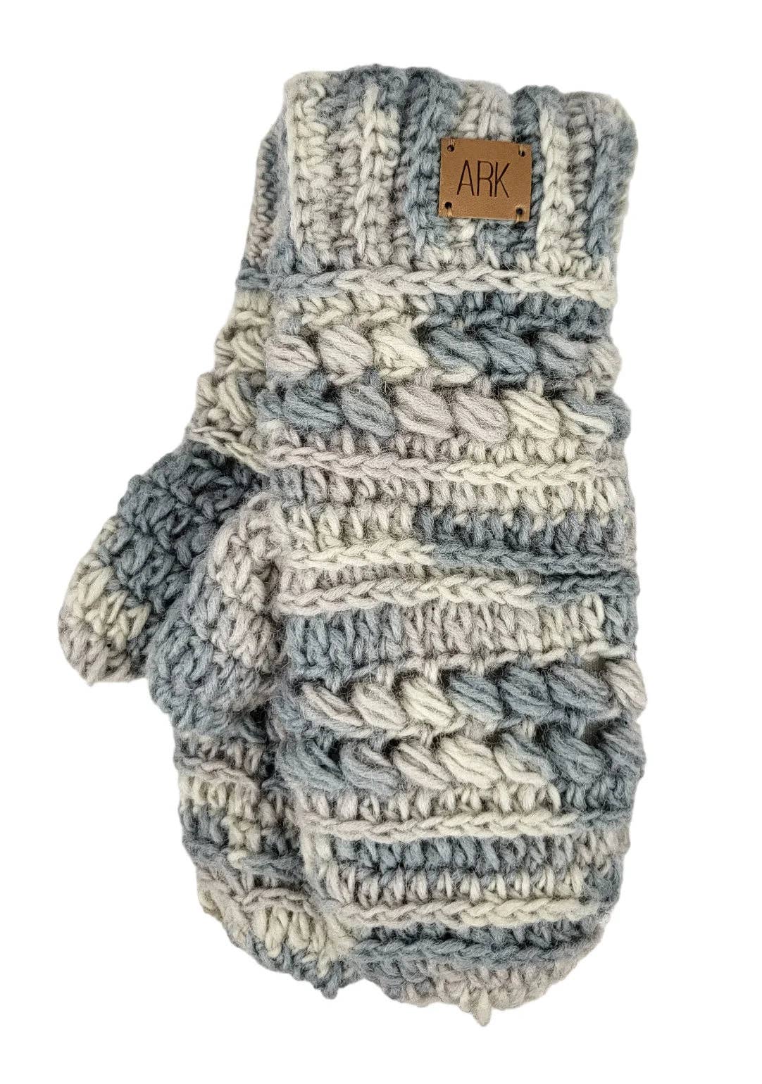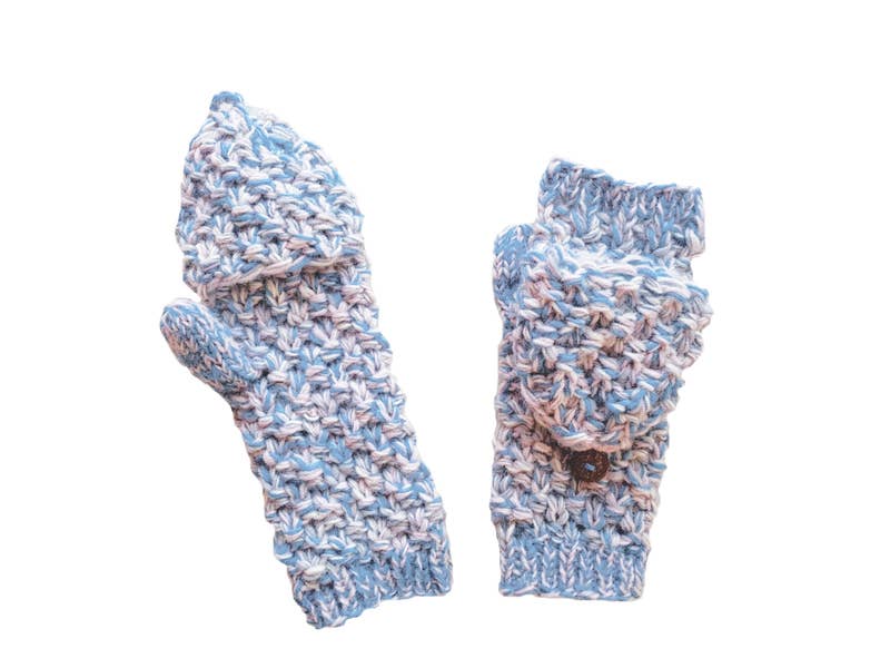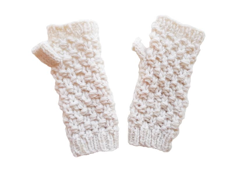 Embrace the winter season with our Cozy Comfort white wool knit mittens. Made from soft, high-quality 4-ply wool and featuring a warm fleece lining, these mittens are perfect for keeping your hands toasty on the coldest days. The unique fingerless design with a fold-back cover offers versatility and convenience, held securely in place by a charming wood button and loop closure.