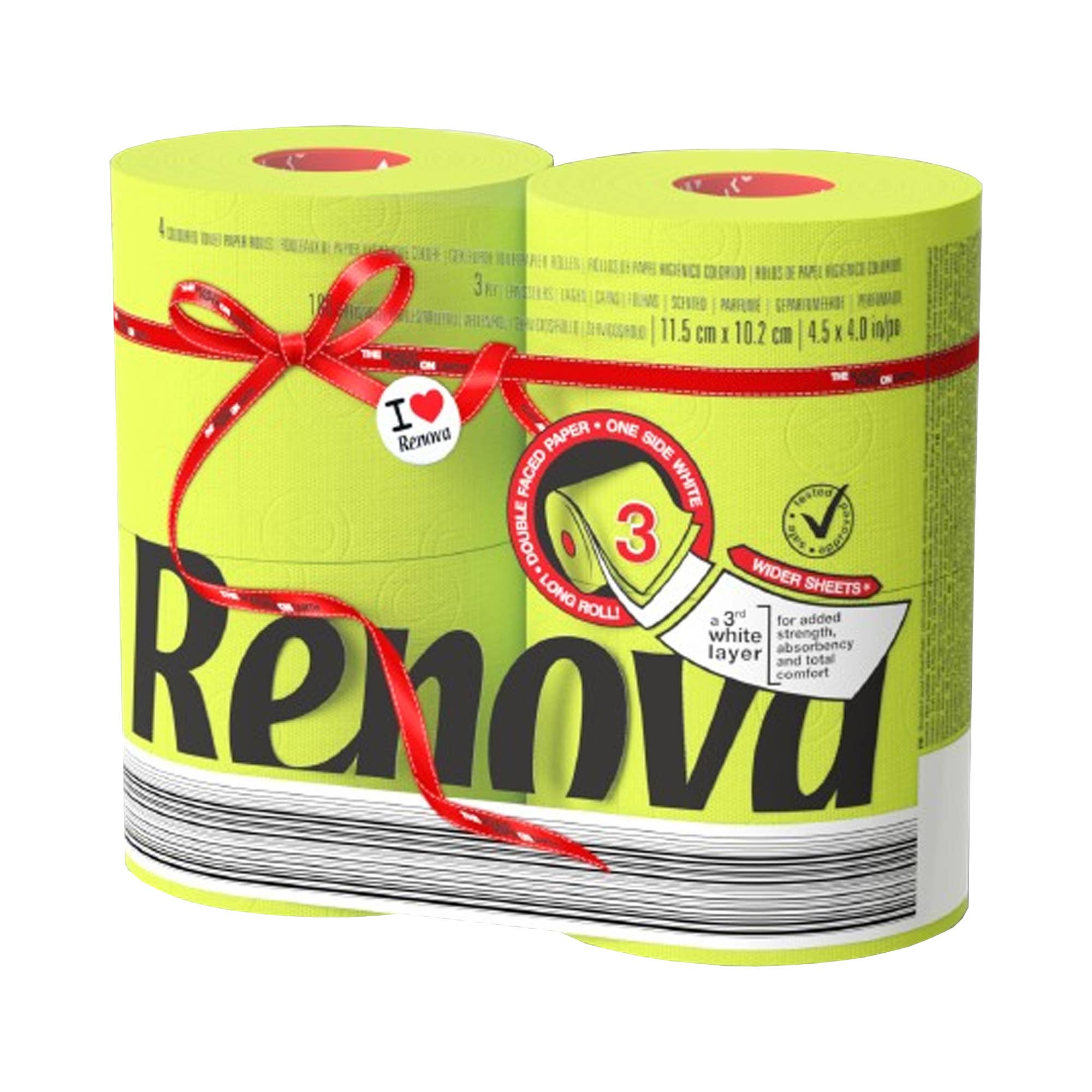 Searching for a distinctive gift idea? Try our Renova Multicolored Toilet Paper Gift Box of 6 Rolls, and surprise your colleagues, friends, and family. Our tissue is made from 100% virgin pulp and Eco-Label certified. All our toilet paper is dermatologically and gynecologically tested, leaving no dyes or marks on your skin. With 140 sheets per roll, measuring 4.5" x 3.7" or a total of 52.9 inches of paper, this toilet tissue is crafted to be a bit more compact than standard rolls. However, its 3-Ply thickness makes sure it performs just as well, delivering as well as a standard jumbo roll while helping you save sheets. Exceptionally absorbent, these colored rolls can effortlessly complement your toilet decor, bath accessories, soap, and towels. The inner black cardboard tube has a subtle light sandalwood scent, while the paper remains fragrance-free. This gift box set features 6 colored rolls: yellow, red, orange, blue, pink, and lime green. To sum up, bring a stylish essen