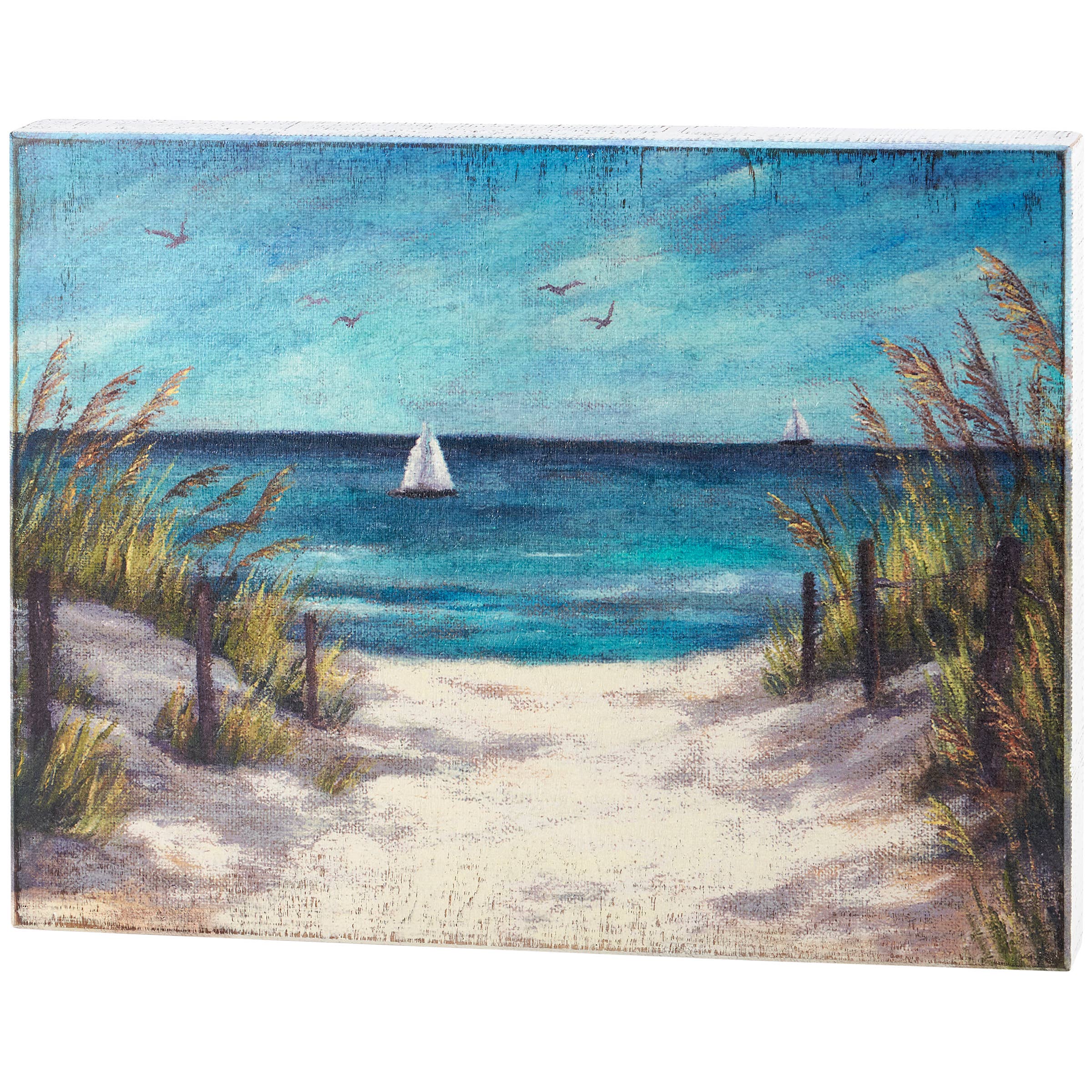 A decorative sailboat from our Beach Collection displaying a driftwood inspired design made of natural wood with painted accents and distressed details. Decorative sailboat features aged metal for the portholes and sail with jute rope accents. Sailboat sits on metal stakes attached to a metal base for a floating display. Our Primitive Sailboat sitter is designed to free-stand on any flat surface making it easy to display. A rustic beach-themed home accent that coordinates well with primitive home décor.
