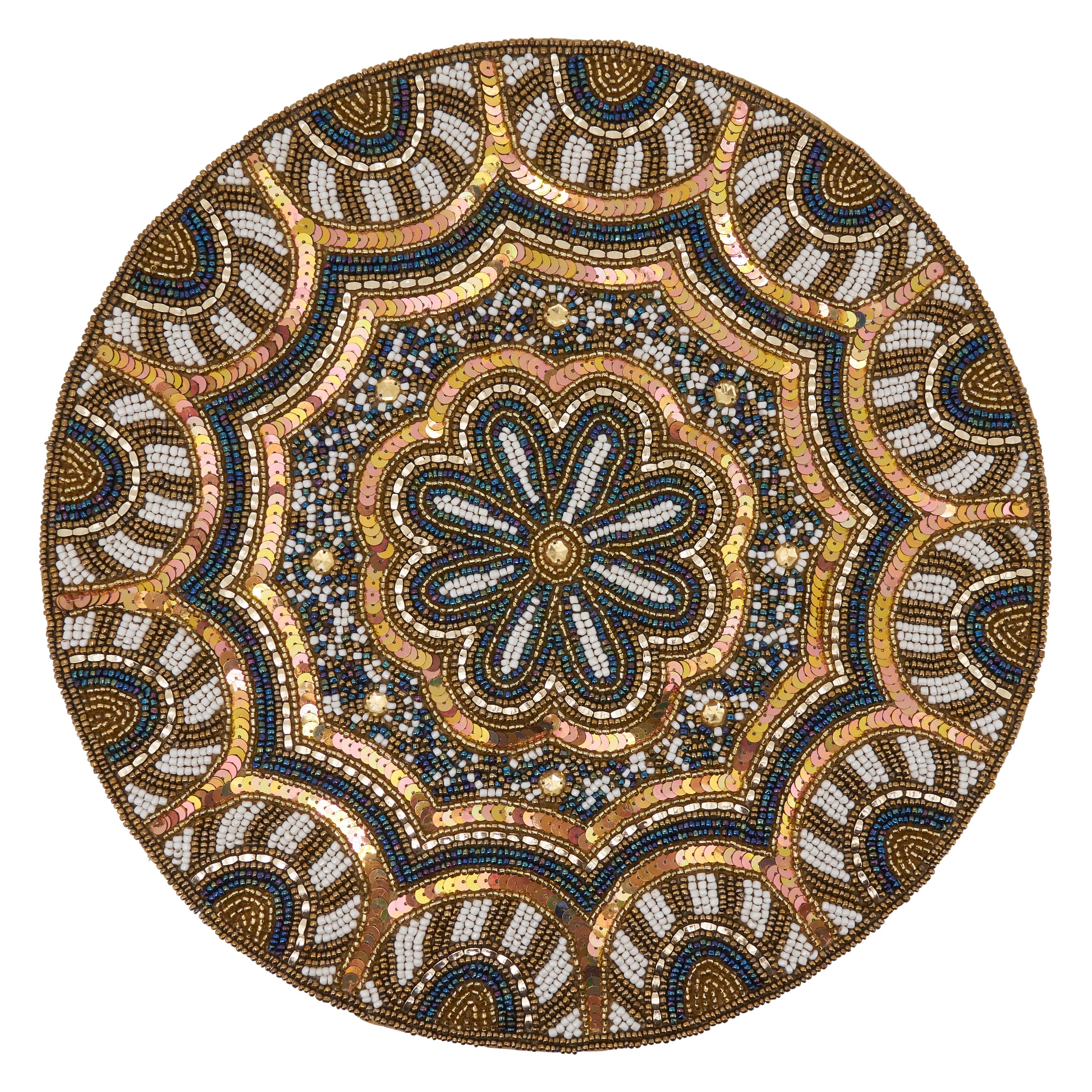 Product Description Inspired by the intricate artistry of Mediterranean tilework, the Majestic Azulejo Beaded Placemat is a triumph of detailed craftsmanship. Thousands of glass beads are meticulously hand-sewn to form a complex, mandala-style pattern in cooling tones of deep azure and bright turquoise, accented by crisp white, emerald green, and a touch of gold. The design features a delicate, multi-scalloped edge and a beautifully layered motif that draws the eye inward. This luxurious, heirloom-quality placemat provides a sophisticated, cultured foundation for both formal and intimate dining occasions. Key Features Heirloom Craftsmanship: Exceptionally detailed hand-beading in an intricate, layered motif. Cool Palette: Rich, refreshing blend of azure, turquoise, and white with metallic accents. Intricate Pattern: Mandala-style design reminiscent of classic Azulejo tilework. Decorative Edge: Finished with a beautiful, multi-scalloped border. Luxury Foundation: Soft backing protects fine furniture surfaces. Care Instructions Spot clean with mild soap and a soft cloth; lay flat to air dry; do not submerge or place hot items on surface.