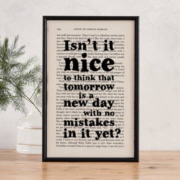 Anne of Green Gables framed book page print with uplifting and motivational quote "Isn't it nice to think that tomorrow is a new day with no mistakes in it yet?" Perfect for book lovers, bookworms, readers, bibliophiles, bookshops and bookstores. - no glass - lightweight frames made from wood from sustainably managed forests - available in packs of four - can hang neat to the wall or stand freely Frames are handmade in-house in the UK. The pages measure approx 14cm x 20cm (5.5 inches x 8 inches) They're 3cm deep with 0.3cm of black frame border.