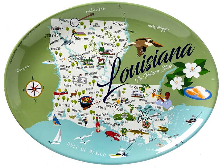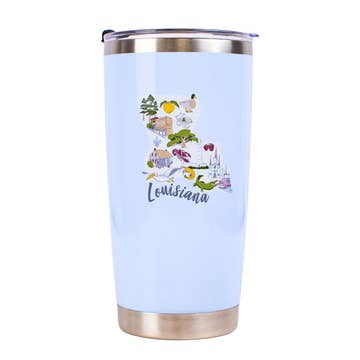 Whimsical depiction of Louisiana on a white 20-oz. Insulated stainless steel tumbler. Plastic lid included. Original Galleyware artwork shows the towns, sites and attractions. Hand washing recommended. 7.5" X 3.5" X 3.5". Decorated in the USA