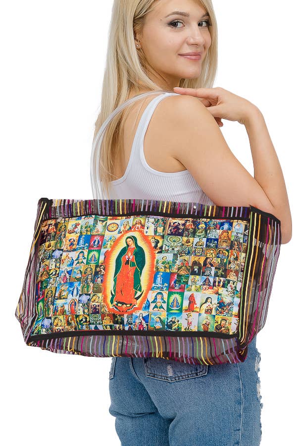 La Loteria Portrait Print Rope Handle Zippered Canvas Tote Bag -Dimensions: 19.75" * 15" * 5.25" -1 x Zipper Closure Main Compartment -1 x Inner Auxiliary Pocket -100% Canvas -CA Prop 65 Advisory