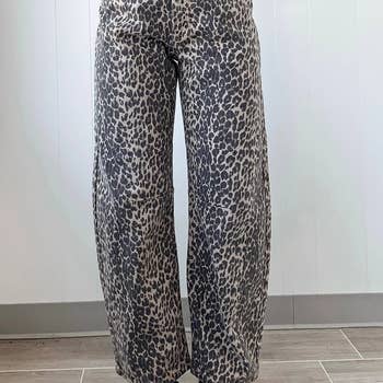 HIGH RISE REOPARD HORSESHOE JEANS BEIGE WASH COMFORT STRETCH BACK PATCH POCKET ZIP FLY WITH BUTTON CLOSURE BALLOON WIDE RELAXED DENIM NON DISTRESSED DART DETAILS REGULAR HEM RISE 11" INSEAM 26.5" WB 1.5" IN SIZE 5/26 98% COTTON, 2% SPANDEX 14.06 OZ