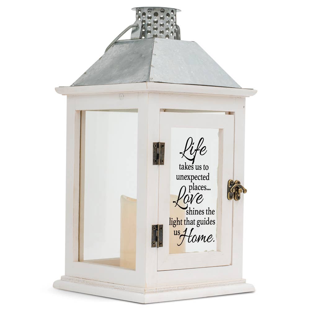 "Goodbyes are not forever; goodbyes are not the end. They quietly mean I will miss you until we meet again." A comforting gift in times of bereavement, this attractive wood lantern is white with rustic distressed edges. A curved silver metal roof, industrial flute accent, and carrying handle are the finishing touches. Sides are clear glass all around, with sentiment on front door panel. Curved latch accents the piece while it holds the door securely. Lantern is illuminated from within by the soft flickering of a pillar style LED candle, included. Size of lantern is 12 1/4" high; 6.5" wide x 6.5" deep. Candle uses 3 AAA batteries, not included.