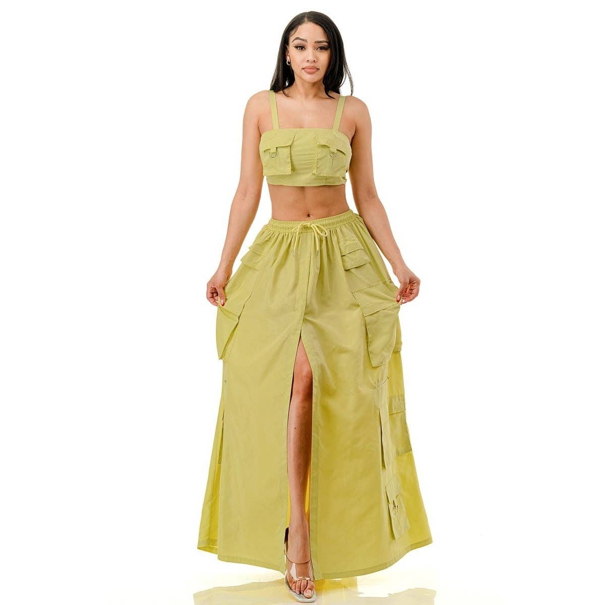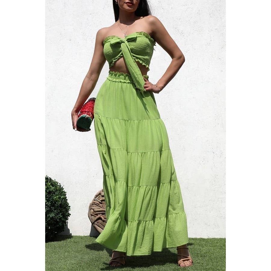 - Style No. : ST74627-3XTH. This plus size skirt set brings charm to life with its dainty floral print, flirty shoulder-tie crop top, and a smocked bodice with ruffled details. The matching tiered maxi skirt flows effortlessly and features an elastic waist for comfort and pockets for ease. The set offers a flattering fit with a breezy silhouette that moves with you.