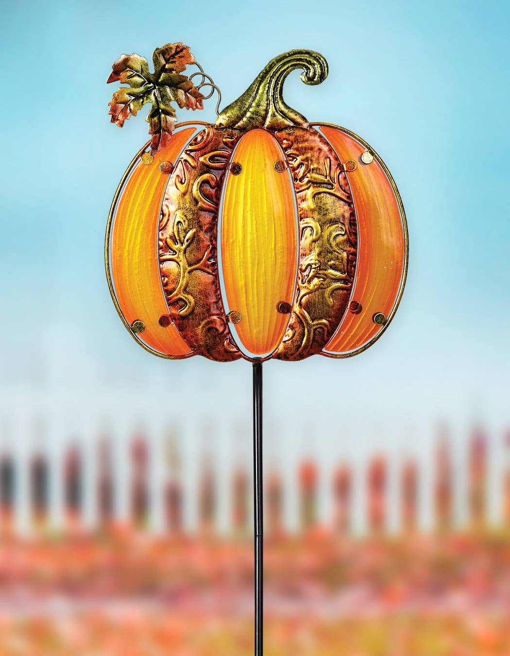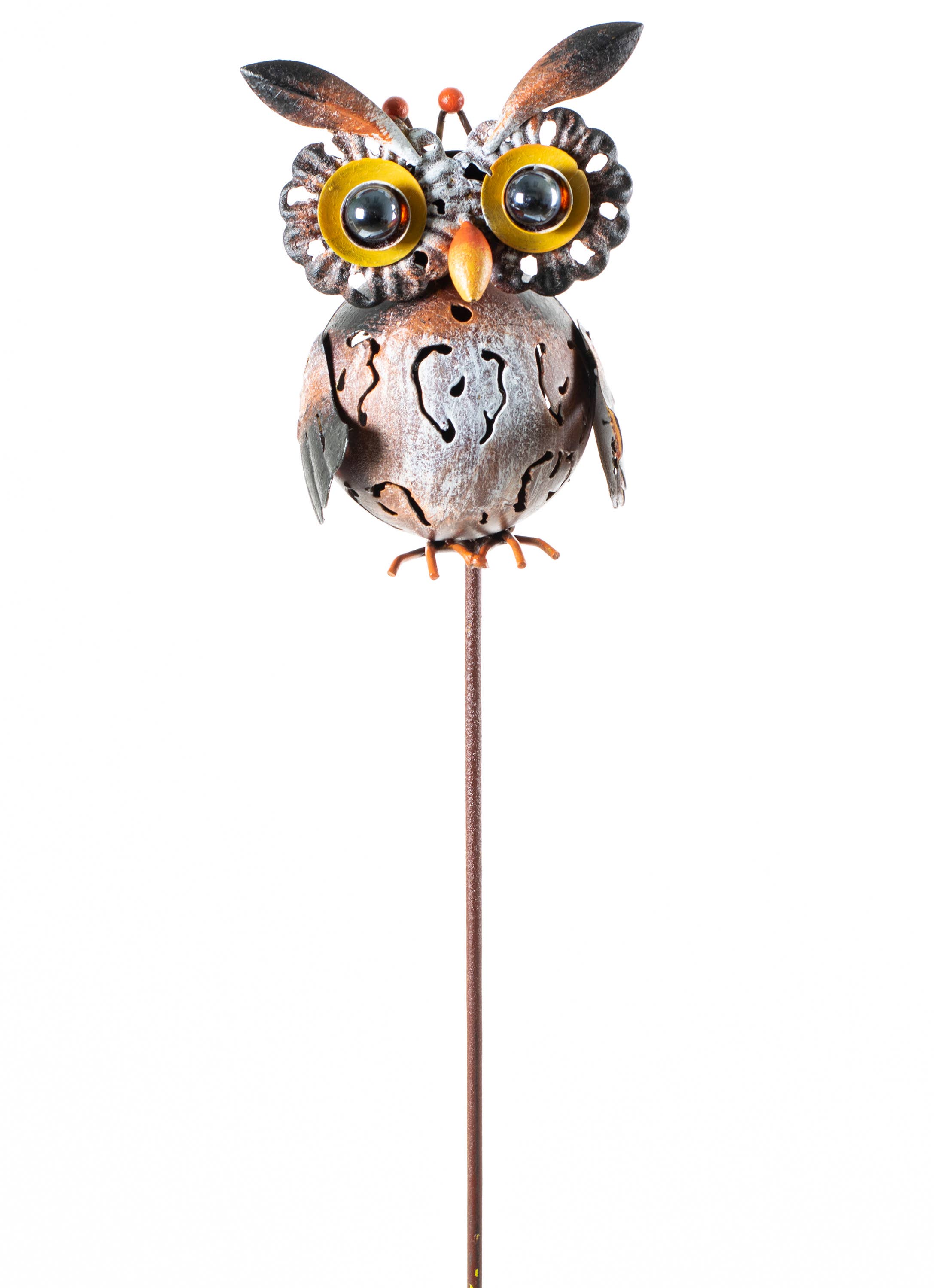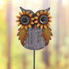 This rustic & charming Owl stake is hand crafted in layered metal and is filled with warm fall hues of gold, amber & brown. The sunflower eyes of the owl are multi dimensional and extend from the owl body. A perfect accent for front porch hedge or entrance way. Stands 44” above ground. Please Note* This item is crafted with metal and is designed to rust over time, enhancing the “Rustic Charm” style. Handcrafted with rustic finish. Features 2d Sunflower eyes. Includes 4” ground stabilizing peg. Make a great gift! Measures approximately: 12" x 3" x 48.25"