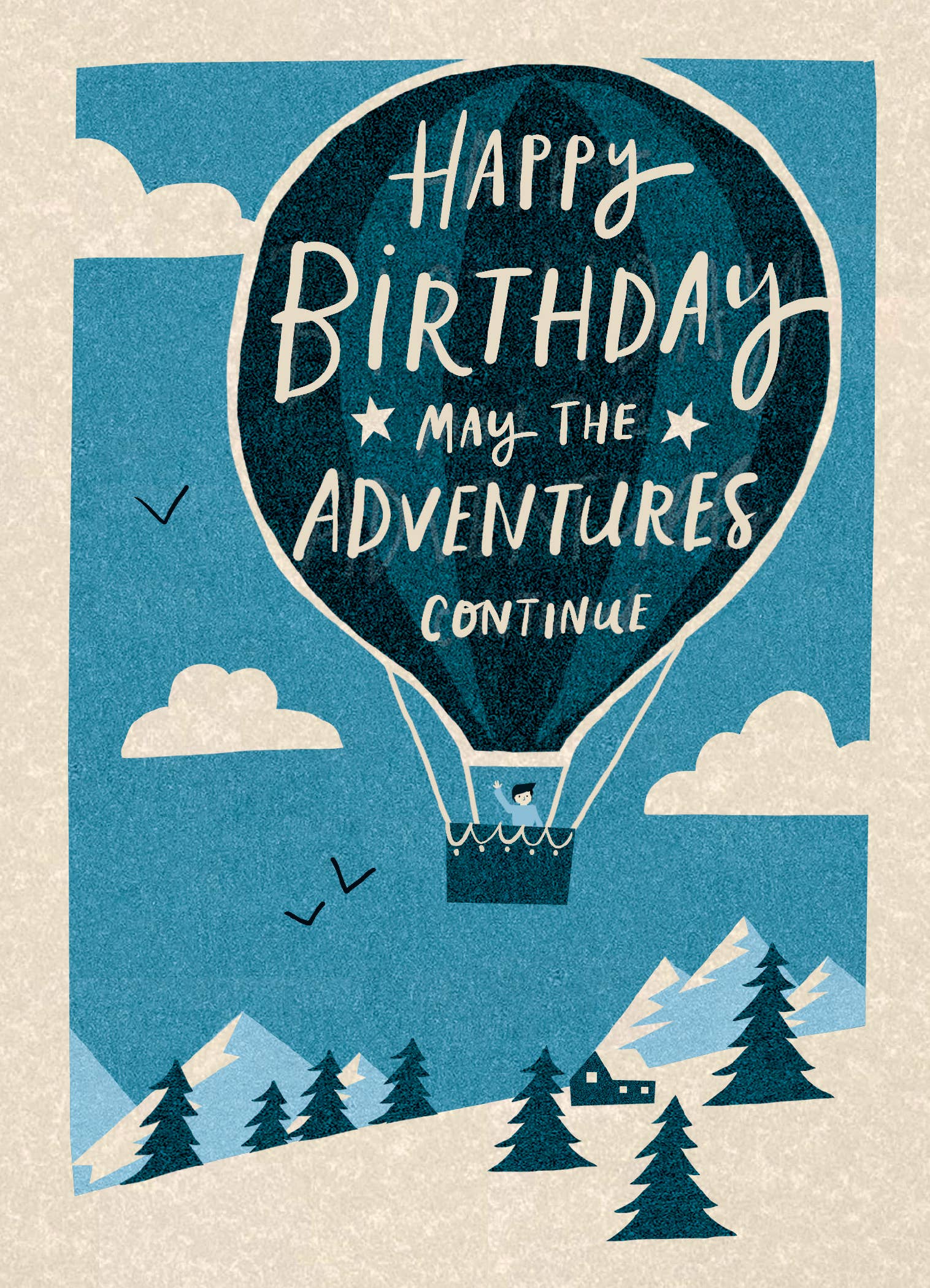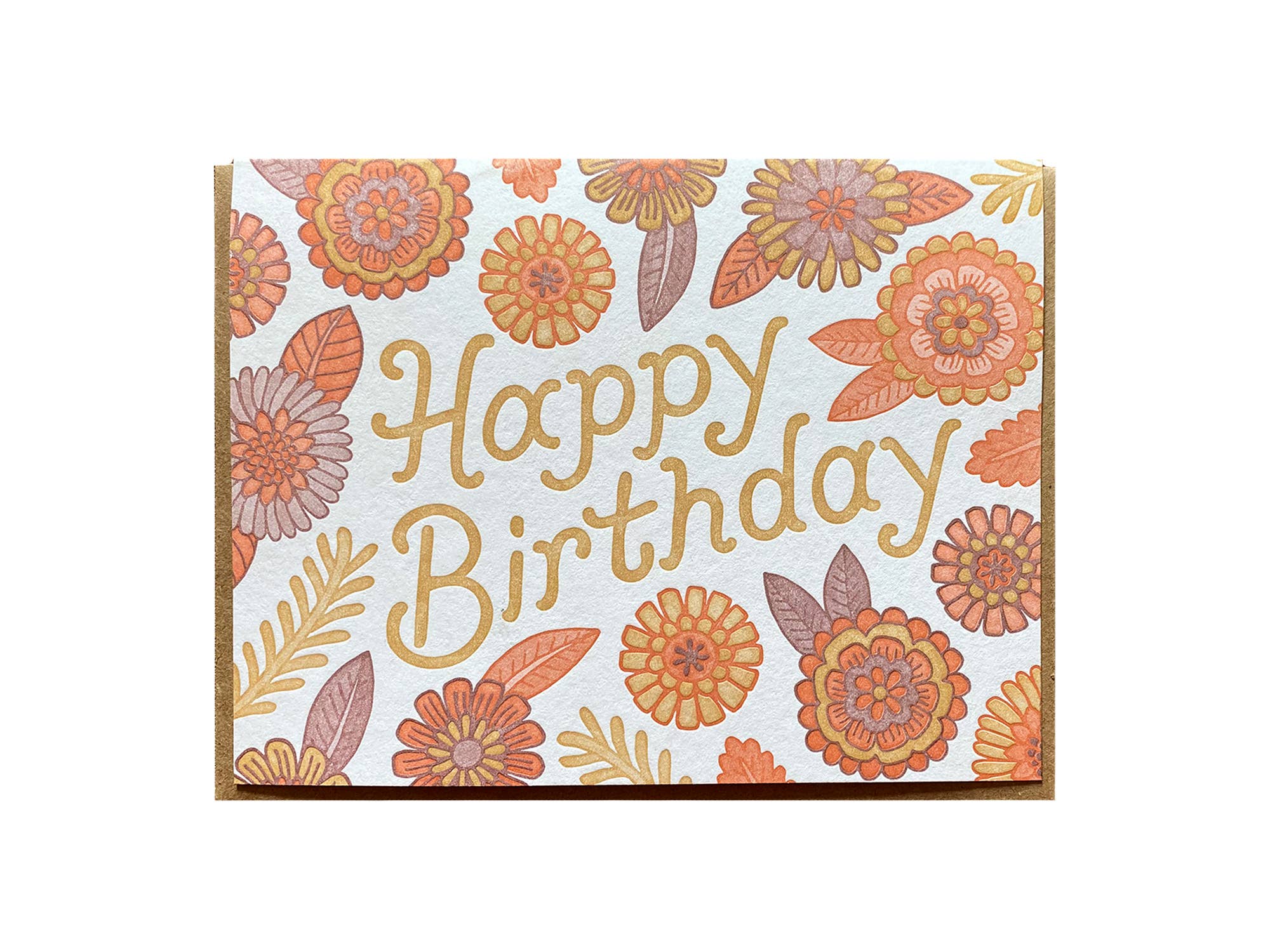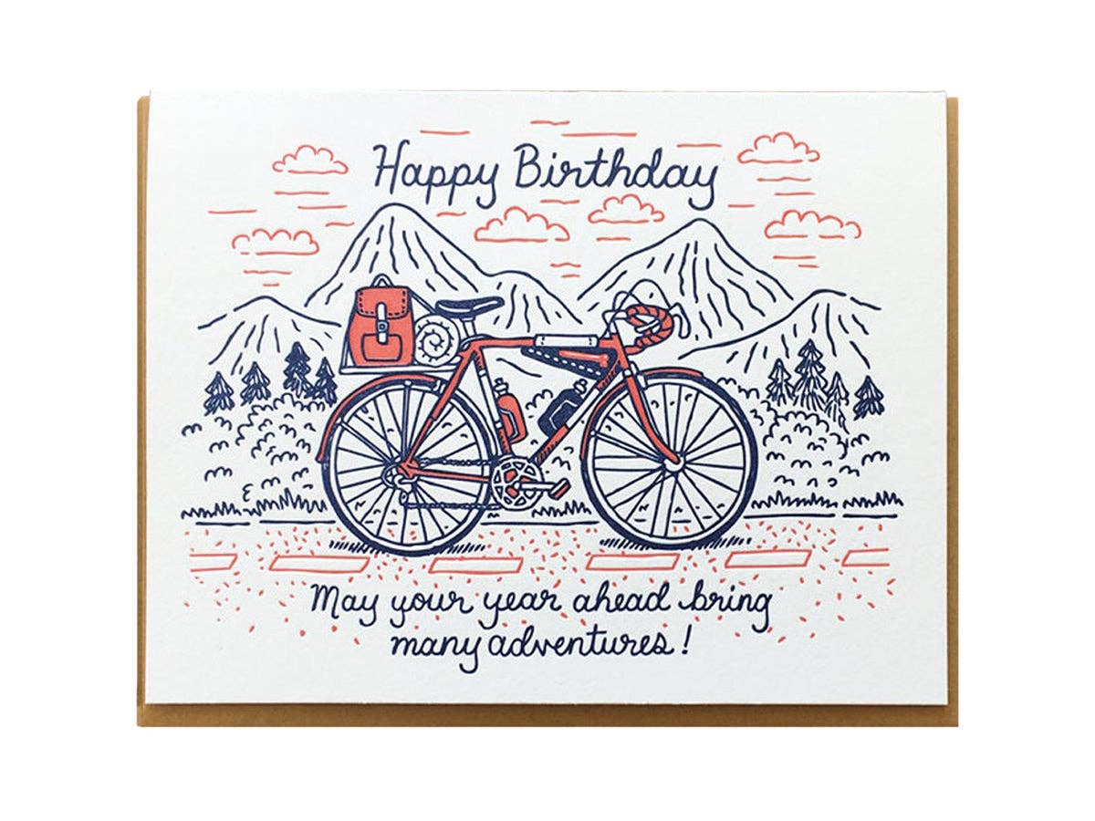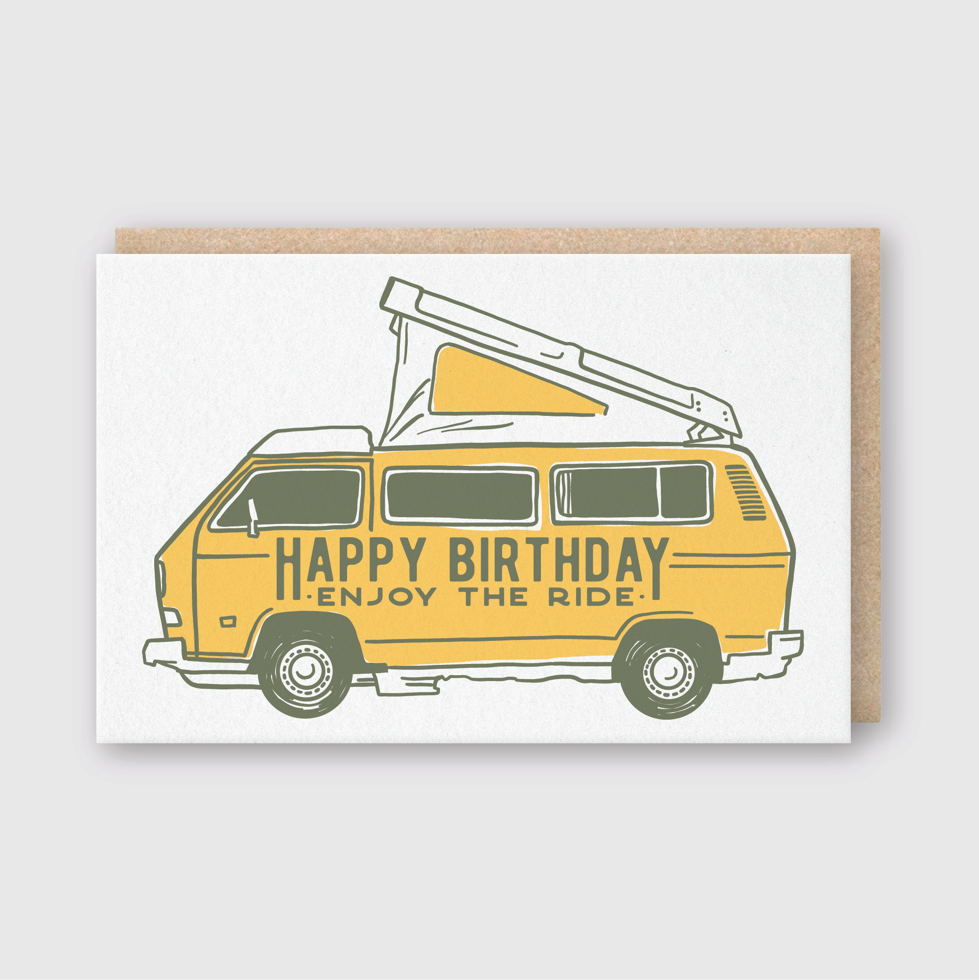 Letterpress printed folded card, blank inside Size A2 (4-1/4" x 5-1/2") Image Description: a white folded screen printed card with an orange van on the front, orange text about "Happy Birthday", text below "here's to another year full of adventures" All images, products and designs © Noteworthy Paper & Press