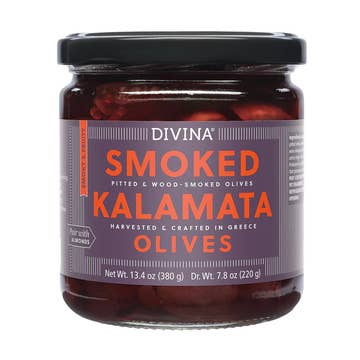 Sundried Kalamata olives that have been hardwood smoked and jarred in a mild salt brine. They are mildly sweet with a raisin like texture. Great served in a salad, on a charcuterie board or just for snacking. -250ml/8oz Jar -Ingredients: Kalamata olives, water, salt, citric acid.
