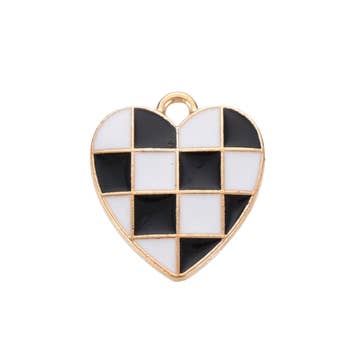 Add a bold touch to your jewelry with this checkered heart charm, crafted from alloy and finished in a stylish gold tone. Featuring a trendy black-and-white checkerboard design, this charm brings a playful yet edgy vibe to bracelets, necklaces, or keychains. A customer favorite for Y2K, retro, and indie-inspired jewelry, it’s the perfect addition to any charm bar display. Great for boutiques, gift shops, and DIY creators looking for fun, fashion-forward jewelry supplies. DETAILS: Alloy & Enamel 17.5x15.5x1.5mm This charm comes with a 5mm jump ring pre-installed. If you do not need jump rings, please message us prior to placing your order.