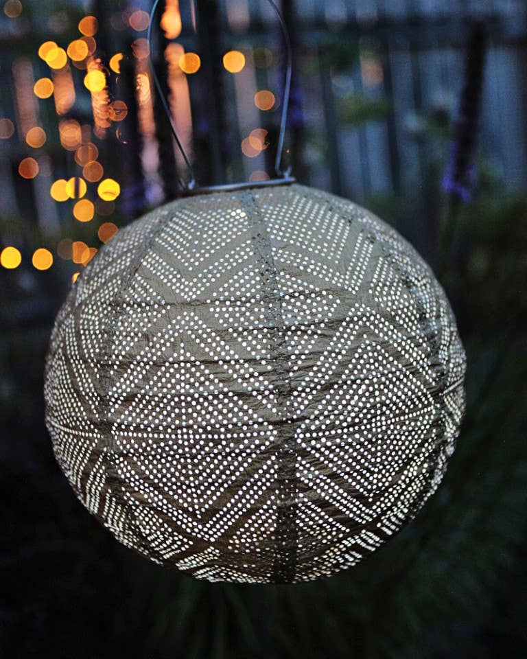 Perfect for hanging, tabletop displays, or accent lighting in gardens and patios, the Stella Drum Solar Lantern combines modern aesthetics and sustainable design. Enhance your outdoor living space with the Sojiâ„¢ Stella Drum Solar Lantern, a striking blend of modern design and artisanal charm. Featuring an intricate chevron punch pattern, this lantern creates captivating shadows and a warm, inviting glow that transforms patios, gardens, balconies, and backyard retreats. Sojiâ„¢ Solar Lanterns are equipped with one AAA rechargeable battery, solar panel, dual white LED lights and stainless steel hardware. Can accordion-close flat for easy storage or gift wrapping. Designed to be used year-round, spring, summer, Fall, Holiday etc **This lantern now features our NEW and improved solar housing which includes a plastic tab that needs to be removed before operating, please reference this video (https://youtu.be/nXuU1KbCkFI) for set up help.