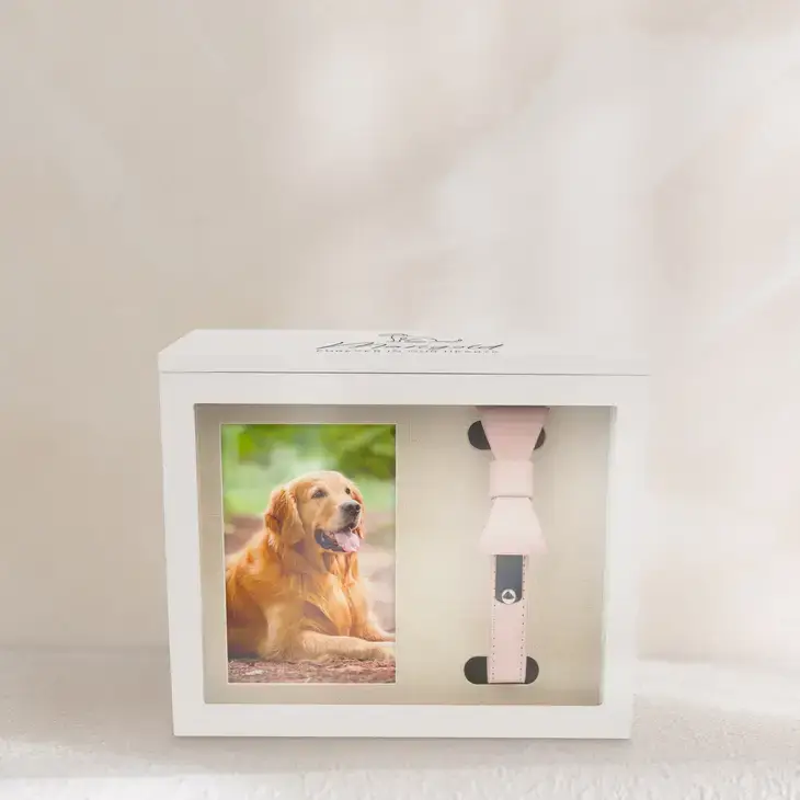 The white box is more than just a storage space. It's a beautiful way to honor and remember a lost pet. It combines a memorial frame, collar display, pet ash box, and keepsake box into a single remembrance tribute. The front of the wooden memory box is a shadow box picture frame. It comes with two special mats that fit a 4" x 6" picture and a collar holder. One mat is for portrait photos, and the other is for landscape. The top of the box is a hinged lid. The lid is printed with the "Tiny Heart" text design. Personalize the box with details like your pet's name. Preserve your cat or dog's favorite items and create a lasting memory. Add photos, toys, their leash, paw print, fur, a favorite treat, or their food bowl. Specifications: Exterior Dimensions: 9.45"(L) x 4.75"(W) x 7.81"(H) 24cm (L) x 12.07cm (W) x 19.83cm (H) Interior Dimensions: 8.75" (L) 3.00" (W) x 7.02" (H) 22cm (L) x 7.62cm (W) x 17.83cm (H) Comes with Vertical and Horizontal Mat Inserts Fits 4" x 6" Photo MDF
