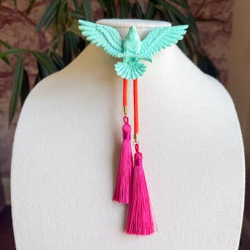A nod to Vernor Panton, this vibrant, angular purple bolo tie with a glossy, geometric centerpiece and shimmering cord ends evokes strong mid-century modern vibes with a futuristic twist. It is 38 inches long with a purple braided vegan leather cord.