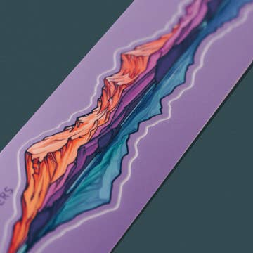 This Miniscape shows Mt. Baker and the Twin Sisters alight with Alpenglow. Alpenglow is a spectacular phenomenon where mountains are illuminated when the sun is at the horizon, which turns the peaks vibrant shades of pinks, purples, blues, and orange. This is a Miniscape, an extra small Infinity Sticker. Size: 2” x 10” Material: quality vinyl