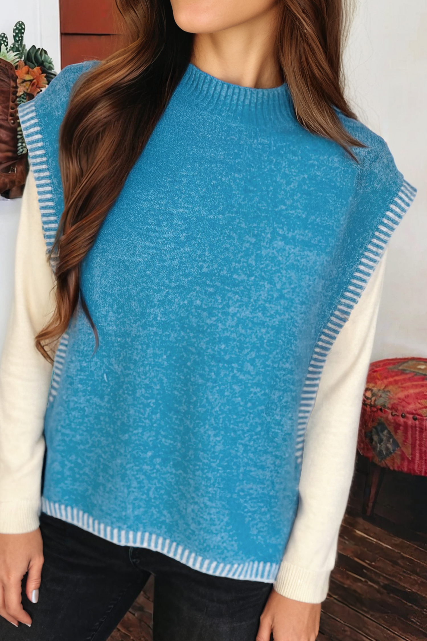 The turtleneck sweater knit vest is a stylish and cozy addition to any wardrobe. With its high turtleneck collar and sleeveless design, this knit vest provides warmth while allowing for easy layering over shirts or blouses. The soft knit fabric ensures comfort, making it a perfect piece for transitioning between seasons. Ideal for both casual and more polished looks, it pairs well with jeans, skirts, or tailored trousers. -Model is 5'9" and wearing a S/M