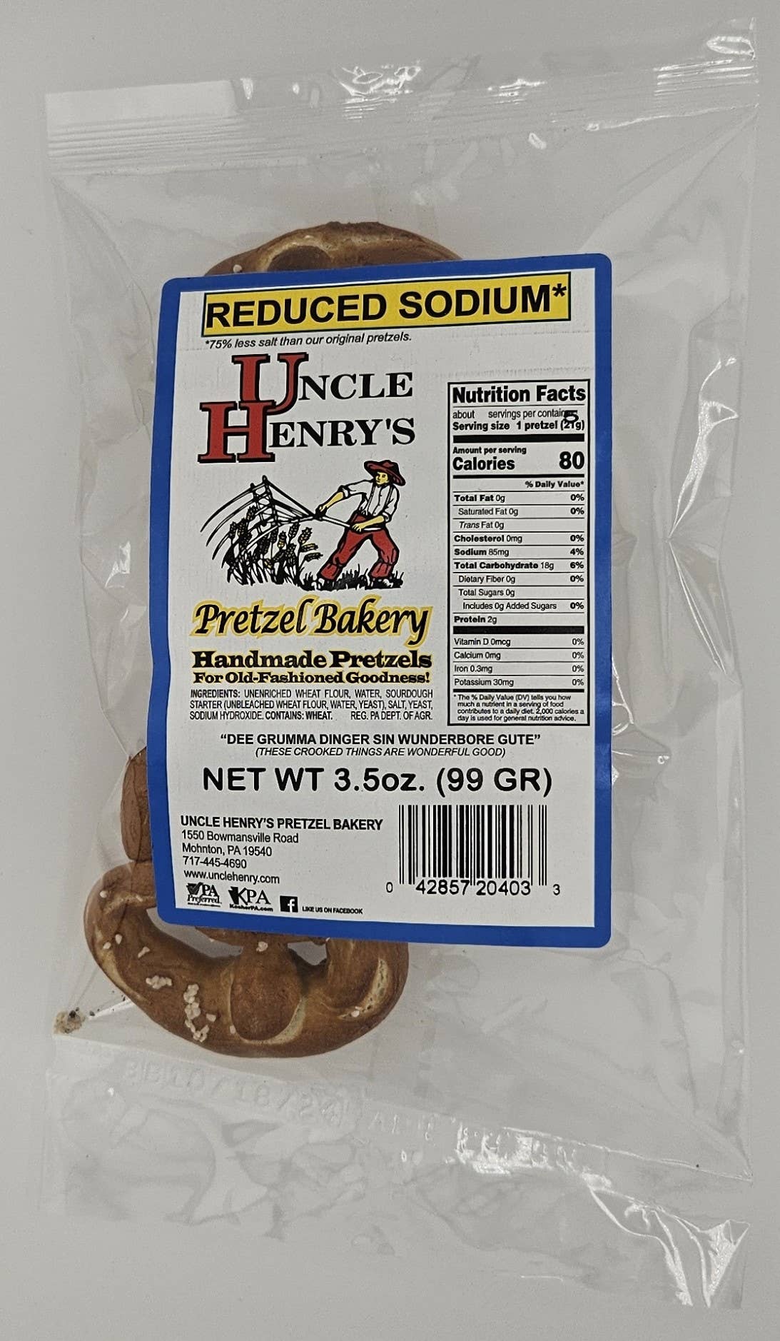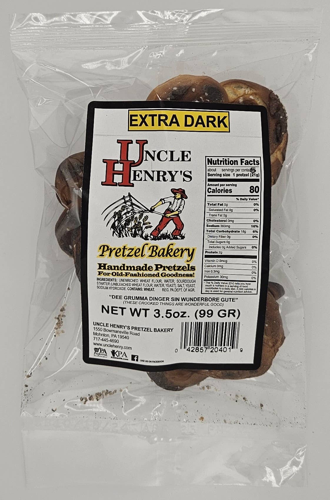 Baked Sourdough Pretzels You’ve probably eaten pretzels before, but have you had Uncle Henry’s old-fashioned, handmade hard pretzels yet? In a world where most foods are mass produced by machines, here’s a chance to get handmade, hand-twisted pretzels authentically made in Pennsylvania Dutch country. Just like you’d rave over a meal your grandma prepared for you, now you can tell all your friends you’ve experienced the delectable delight that is Uncle Henry’s original regular pretzels, complete with just the right amount of salt to tempt your tastebuds. Yummy! Our Pretzels are Hand Rolled, Hand Twisted, then baked in a Stone Hearth Oven. These Hard Pretzels have just the right amount of salt to tempt your taste buds. All our pretzels are handmade and are fragile, some breakage may occur during shipment. For more information visit our website: https://www.unclehenry.com