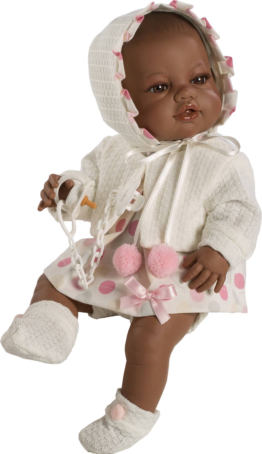 Sweet Crying Baby Brown Jacket, 62 cm The doll has a soft body, scented vinyl legs and arms with a made-up face and eyelashes, opens and closes its eyes when laid down. Chair not included. Details. Shipping format: Plastic bag + transport box. Size: 62 cm Weight: 1,700 grams Material: Vinyl and soft body. Function: Cries and says "papa" and "mama" when its pacifier is removed. (Batteries included) Brand: Muñecas Berbesa. Made in Spain. WARNING: Not suitable for children under 36 months. Choking hazard. Small parts.