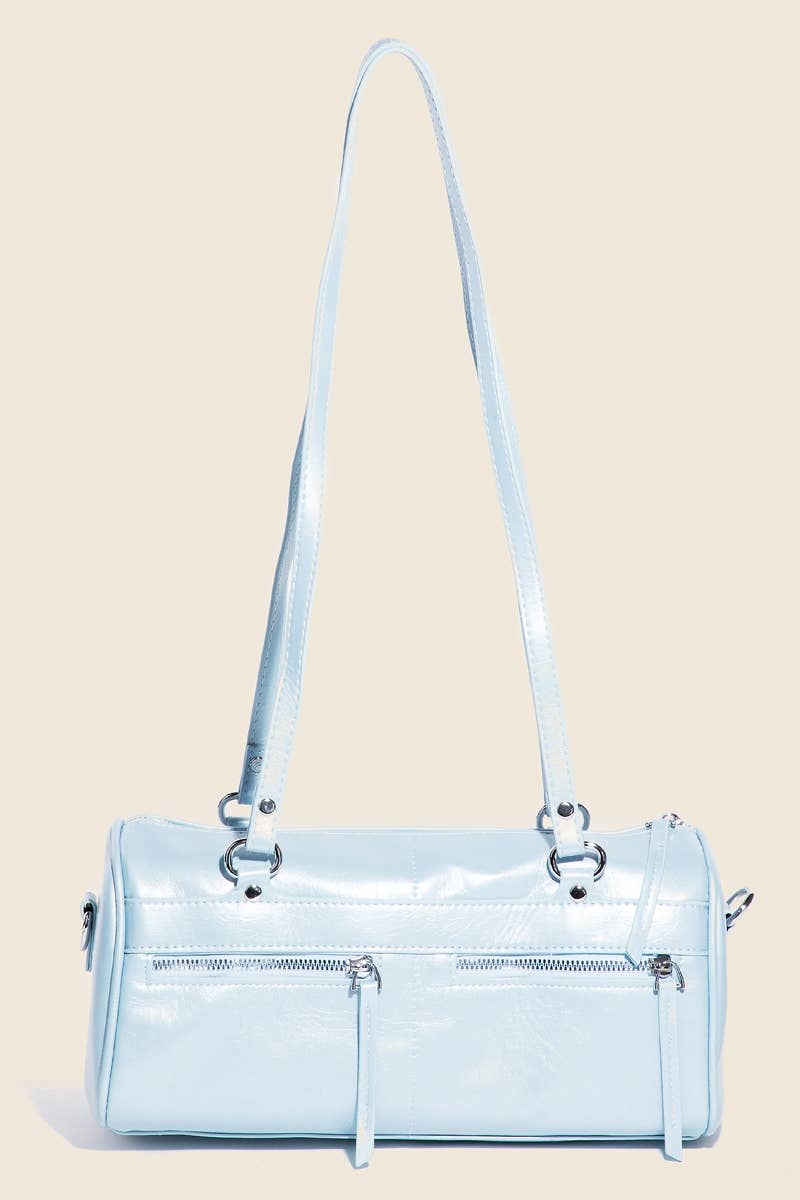 Turn some heads! A sparkling diamond-shaped pattern covers the front panel of this crossbody sling. * 1 back zip pocket. * 1 front zip pocket. * 22L adjustable strap. * Faux leather with lined interior. * 2 interior slip pockets & 1 zip pocket. * Top zip closure. * Silver hardware. Approximate Size: 9.5L x 11H x 1.5W Model #: BHD-2331