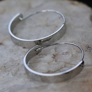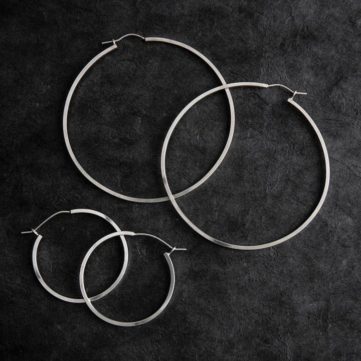 **Please note, these earrings have been updated with a hinged post and latching closure that is not yet pictured. If you'd like to see the closure before purchase, just reach out to Andrea at GlassSkyJewelry@gmail.com and she will happily send a picture!** Pulling together the softness of a simple circle with the strength of squared edges, these hoops offer a subtle, unexpected twist to a classic hoop style that will embolden your own gentle strengths. 1 5/8" x 1 5/8" - Sterling silver with a self-latching, hinged post (Larger pair in first picture are in separate listing.)