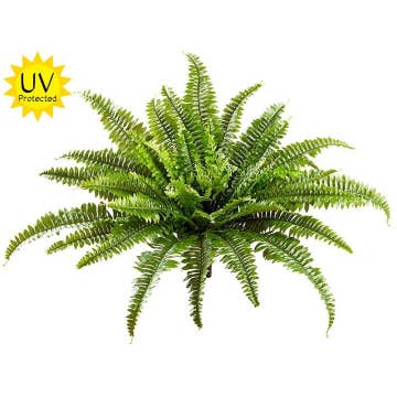 Bring a touch of nature to your projects with this Realistic Faux Boston Fern Bush. Place it in a container for instant greenery. Separate it's green fern sprigs to make it a great addition to floral arrangements, wreaths, and other decorative displays. Size: 26" H (from the bottom of the stem to the top of the tallest branch) Price is for 1 bush Case Quantity: 3 individual bushes Material: Made of polysilk fronds with plastic coated wire stems Container not included Whether you're enhancing arrangements or designing decor, this artificial fern is a go-to for crafters, florists, and decorators alike!