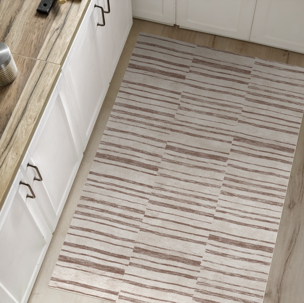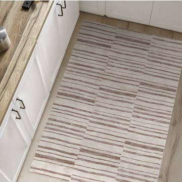 The modern, simple-designed, neutral, goes-with-everything kind of rug. Â Woven with hand tied tassels at each end. Â Great for entry ways, bathrooms, mudrooms, kitchens..anywhere. Â *Note that these do not have a rubber backing so you may want and anti-slip mat underneath. Â 24x52 inches.