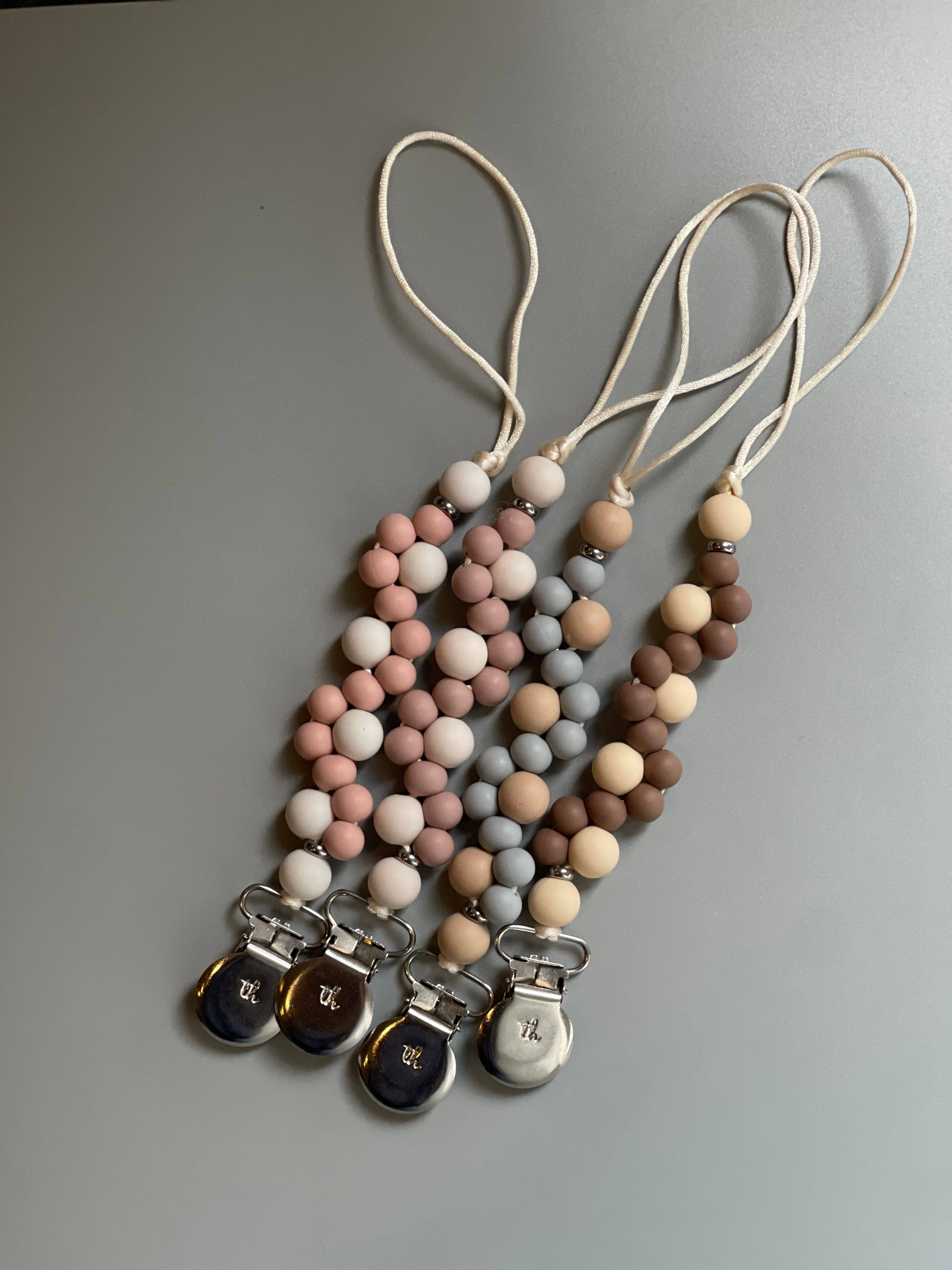 This pacifier clip comes with a stainless steel clip, helping to keep your baby's pacifier in place. Although the clips are safe, they are not intended to be chewed. You can also be use this clip to attach any of our favourite teethers (sold separately). *Beads are made from 100% food grade silicone *Non-toxic (no BPA, lead, PVC, phthalates) *Stainless steel clip *Nylon cord *Wood safety bead SAFETY CERTIFIED: US Safety Standards - ASTM F963-17 Canadian Safety Standards - CCPSA - SOR/2011-17 EN-71
