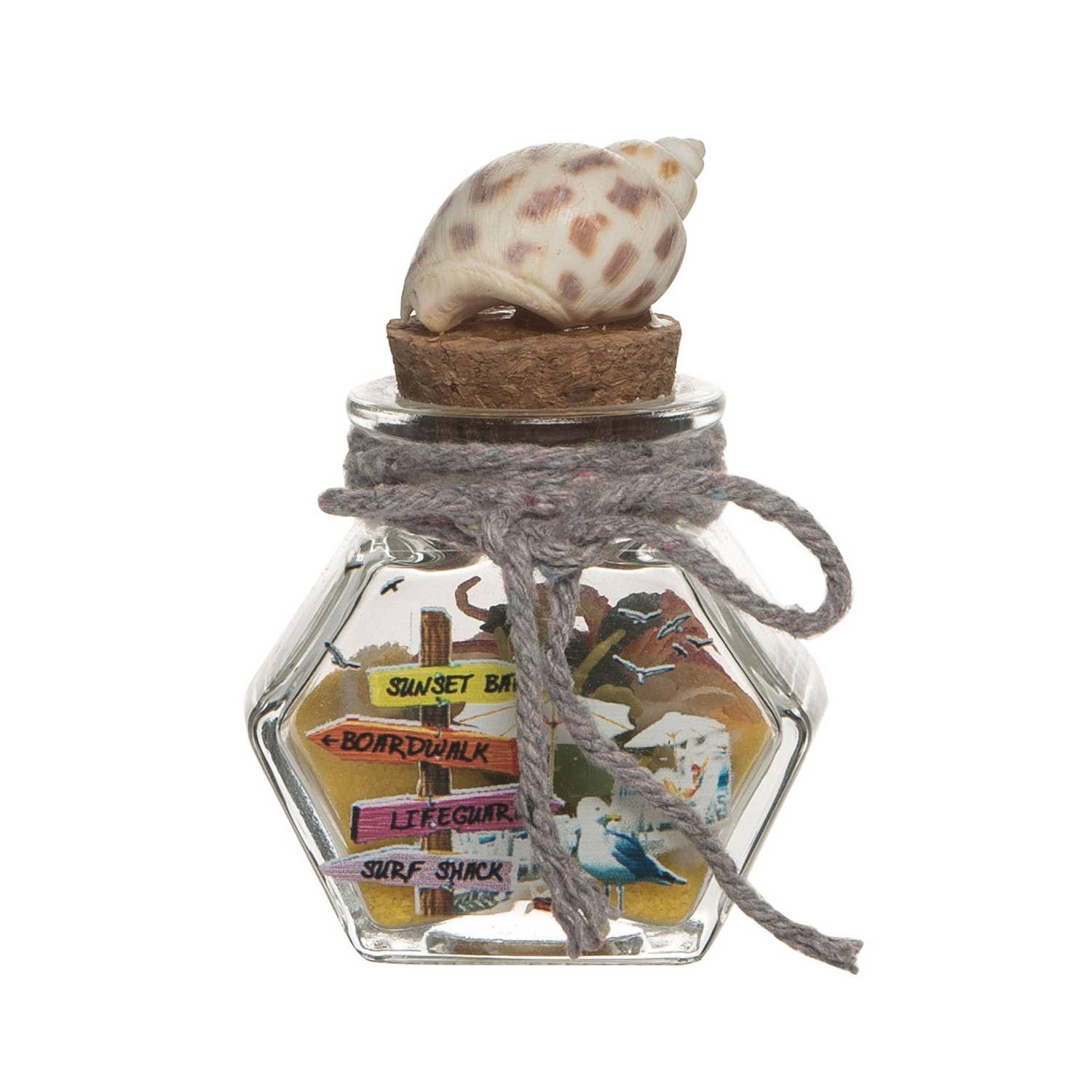 Small potion bottle filled with sand and shells and trimmed with rope and cork.