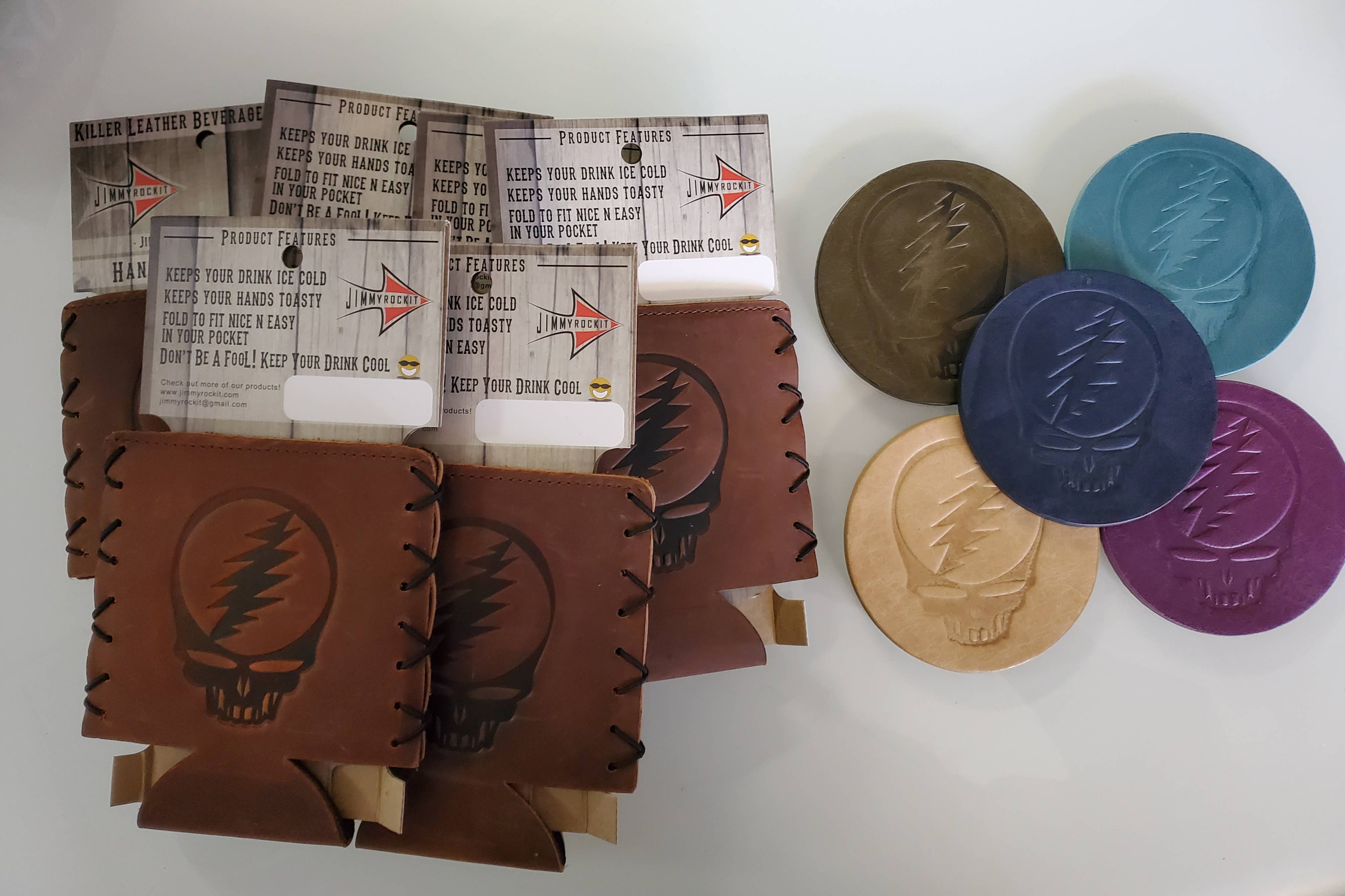Leather Koozie - Steal Your Face Grateful Dead Not all Leather Koozies are the same! Ours are lined with neoprene insulation which is proven to keep drinks colder for longer. The insulation also keeps your can or bottle from sweating and limits condensation. Each Leather Koozie is hand stitched. Choose a design to be stamped on both sides. Comes on a hanging card insert with cool artwork. Pride and Craftsmanship are in every Koozie we make. Check them out! Keep that drink cold! Handmade in the USA