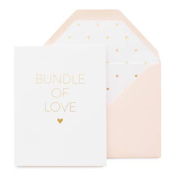 “I think you are the bee’s knees.” Folded greeting card with blank inside to write a personal message. Gold foil text and bees with blind letterpress honeycomb. Details: * A2 (4.25x5.5) 110 lb Cotton, Tree-Free Folded Card | Metallic Satin Gold Foil and Blind Letterpress Ink * Soft Pink Eco-Friendly Envelope | Recycled Content | Metallic Satin Gold Foil Logo on Flap * Each card is blank inside * Each card comes in a clear sleeve made from plant-based polylactic acid (PLA) and is certified compostable * Printed and produced in Petoskey, Michigan