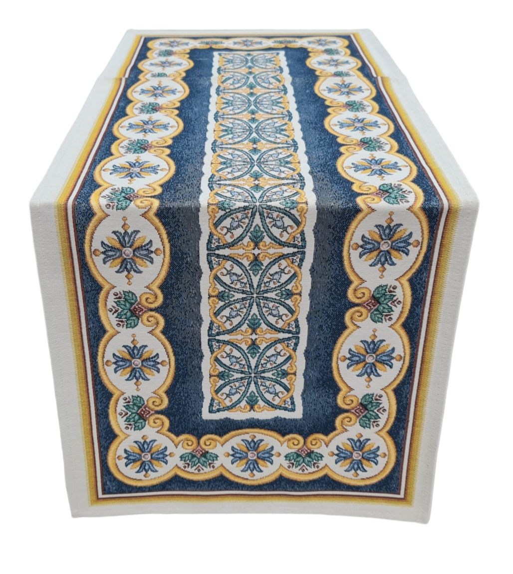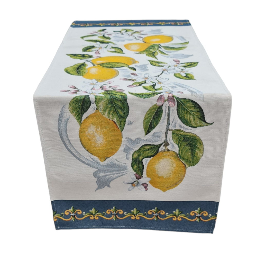 Gobelin fabric runner, Limoni Costiera design. Perfect for decorating the table or any piece of furniture, adding a delicate and modern touch. Size: 40x100cm, 45x140cm Machine washable up to 40 degrees.