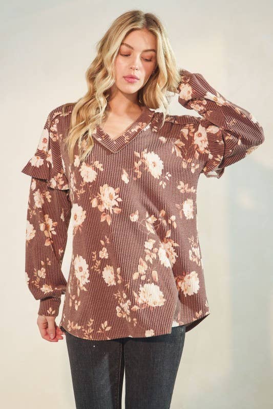 Plus size 1XL-2XL-3XL Made in USA Floral print top featured in a front self-tie and puff sleeve with ruffled * Model is 5'8" and wearing a size 1XL