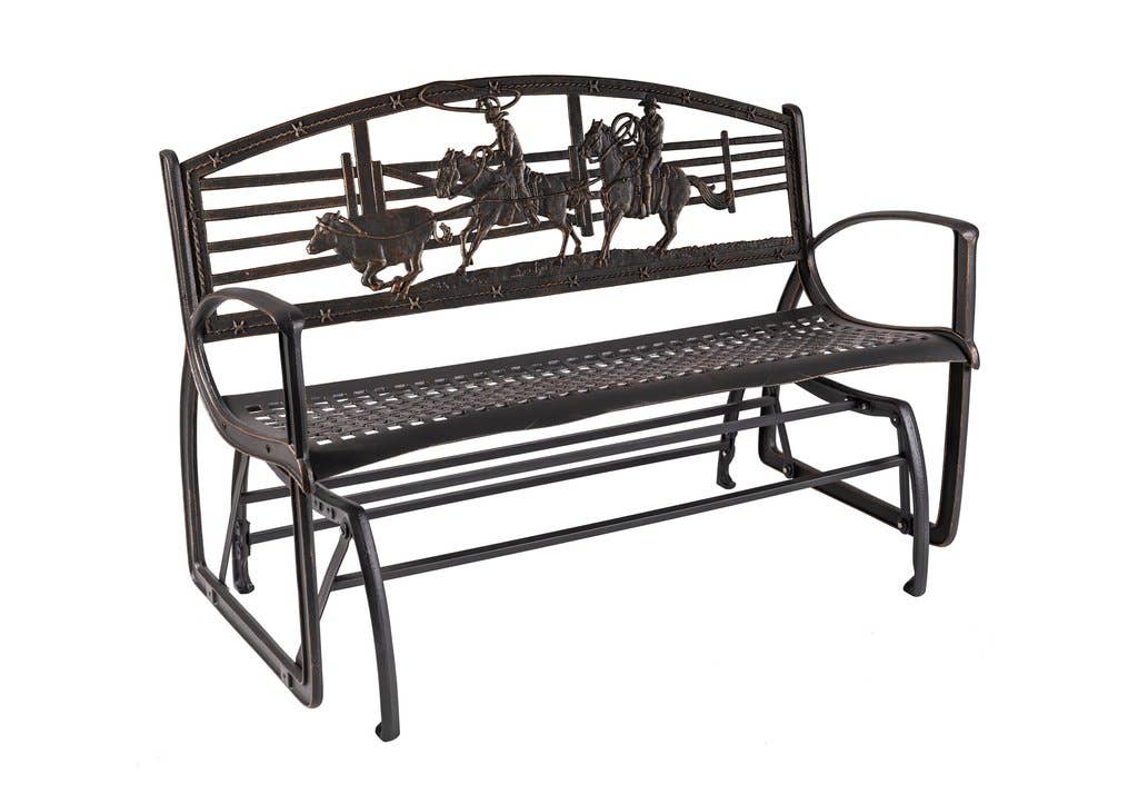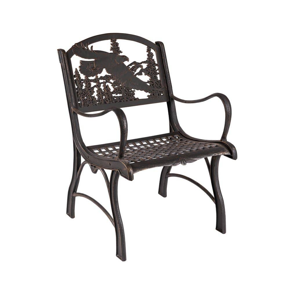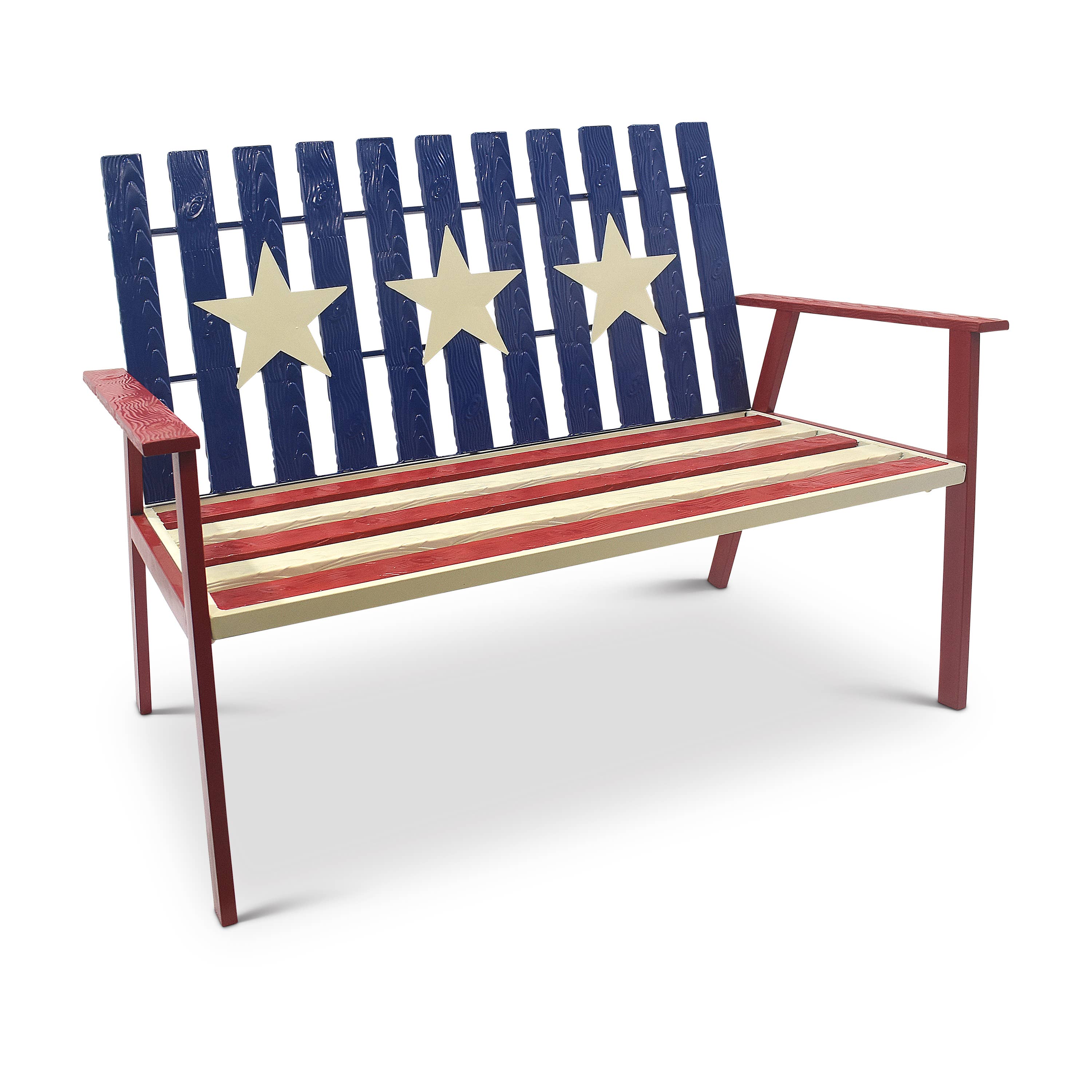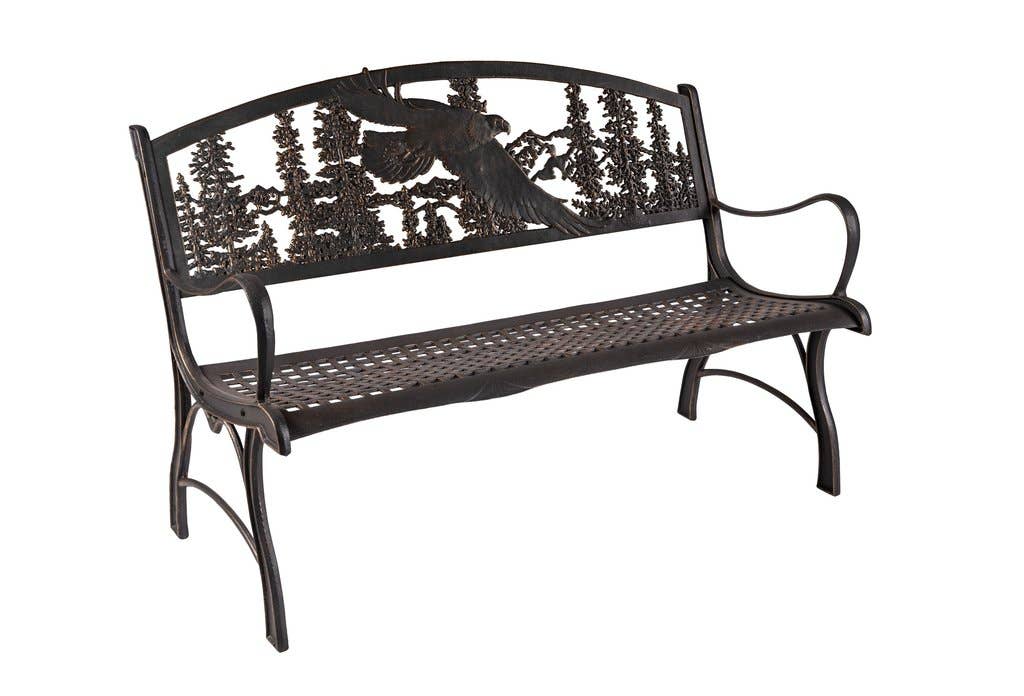 Our Tube Steel benches provide a lighter weight bench option, featuring an umber-toned seat and back frame and slate gray side rails, with an artist-designed cast iron back. The two-tone tube steel Eagle Bench captures the spirit of American with a single eagle in front of an American flag motif. Specifications (fully assembled): 50" wide, 32" tall, and 19" deep. Seat height 16". Product weight: 50 lbs. Seat capacity: 500 lbs.