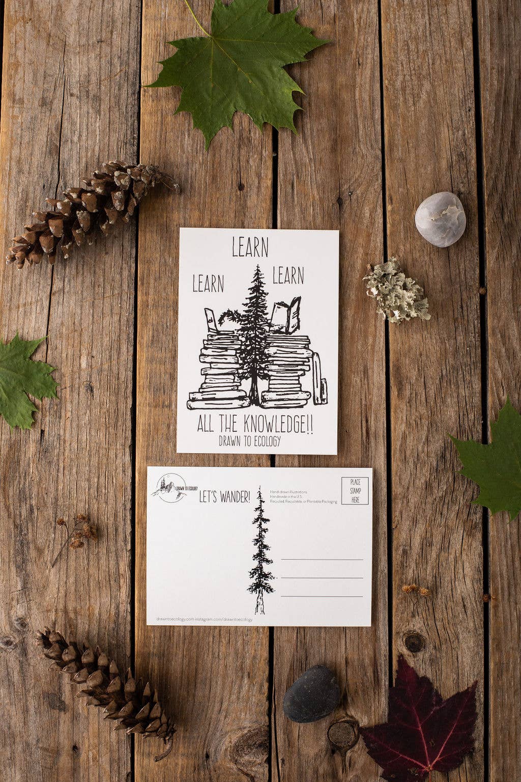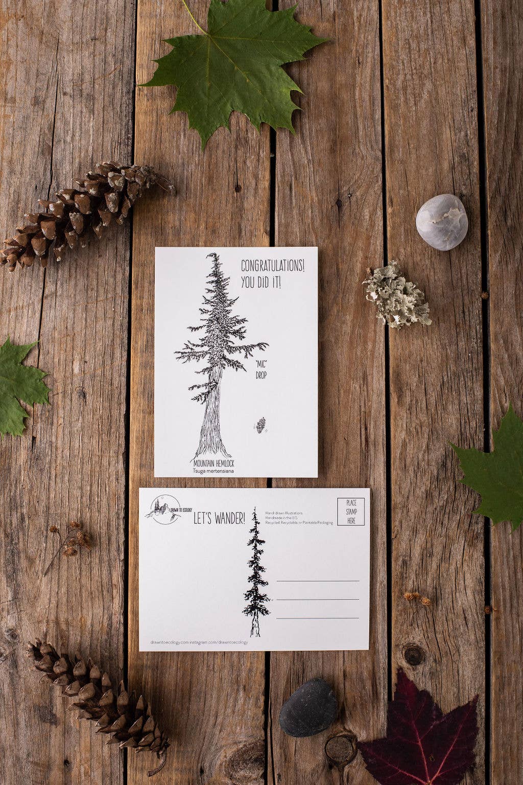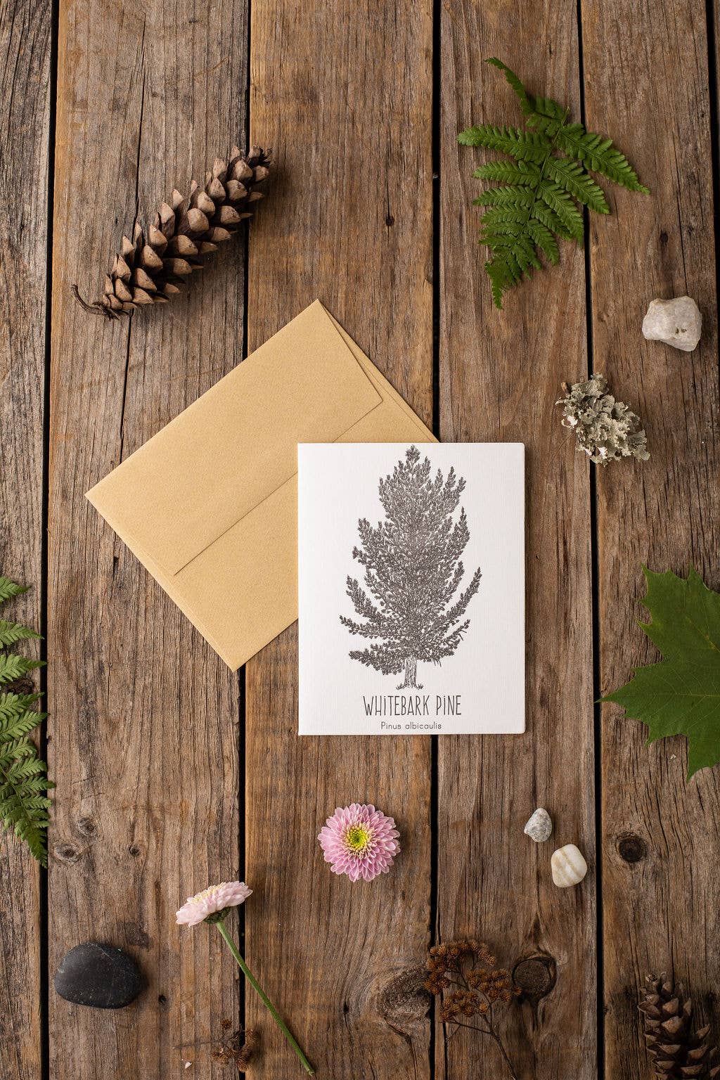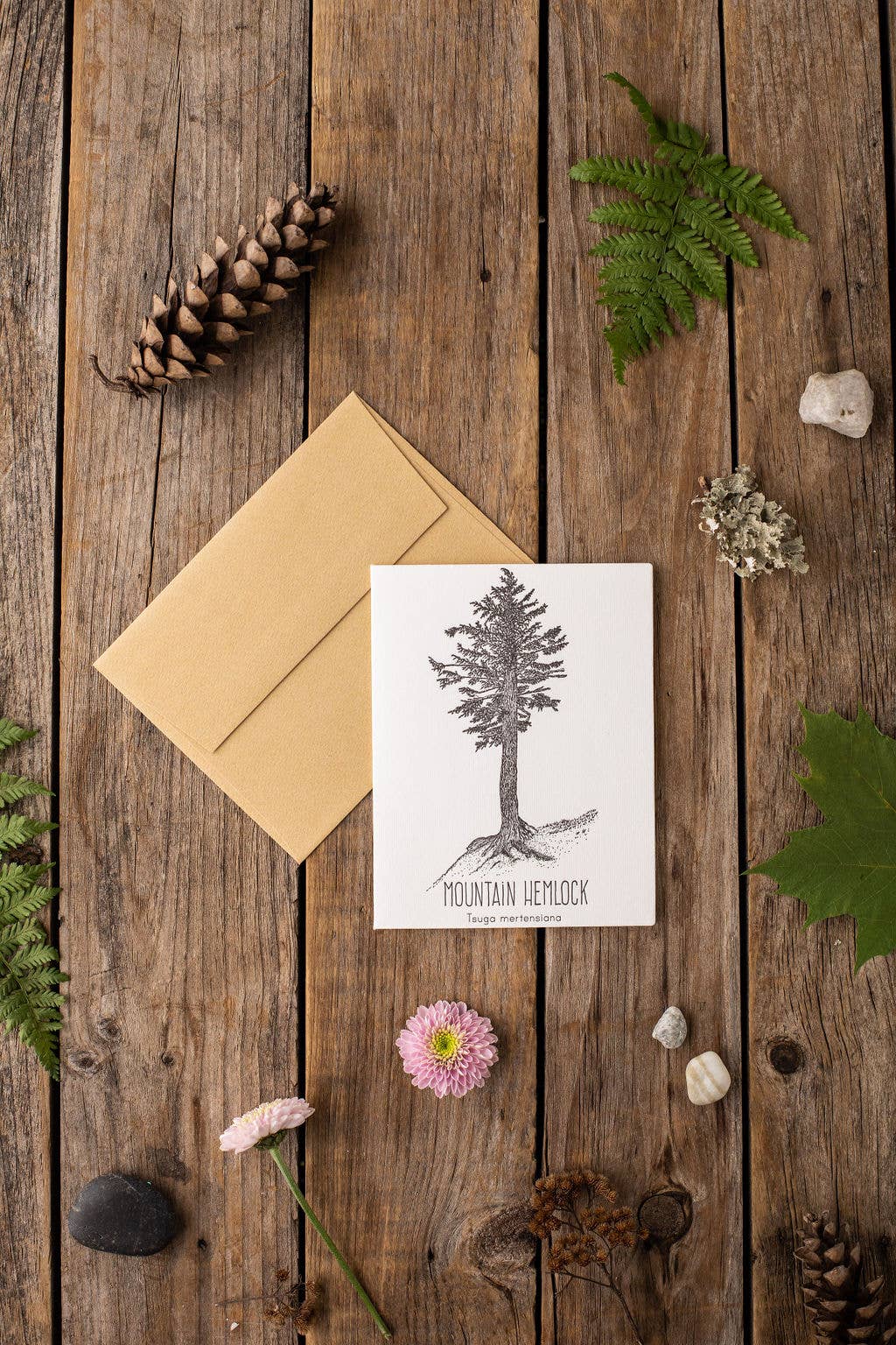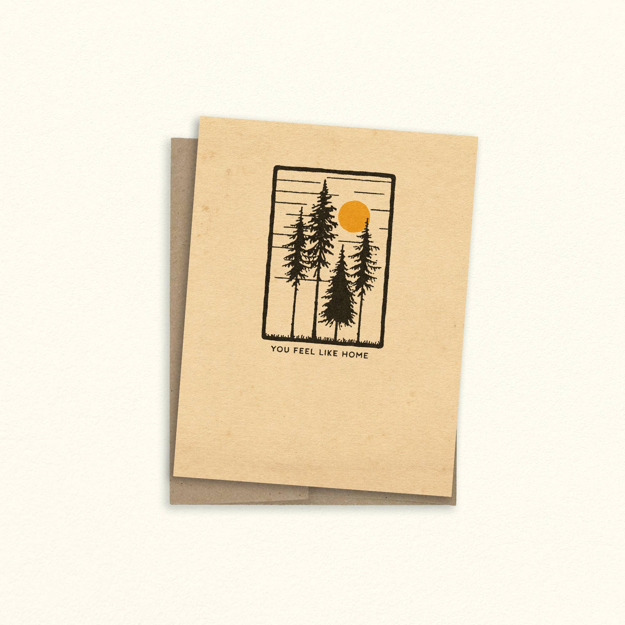 Sustainably harvested paper. Hand-drawn illustration. Letterpressed & Hand packaged in Massachusetts. Recycled content envelope included. Size 4" x 6". Blank inside.