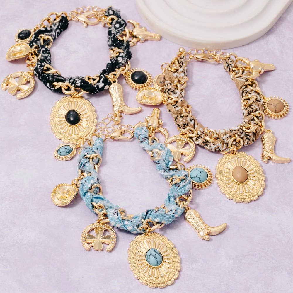 This necklace introduces a unique western stone set concho charms paisley bandana and chain braided style. Discover the perfect balance of subtlety and flair as this necklace effortlessly completes your look. COWBOY HAT, COWBOY BOOT, BULL HEAD, STONE SET CONCHO OVAL MADE IN CHINA 20% STEEL 40% POLY COTTON 20% ZINC 10% RECON 10% GALSS
