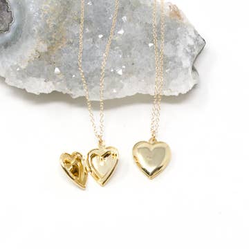 The sweetest heart locket necklace! This is a working locket that could fit a tiny photo or momento, if desired. This is a great gift idea to have in stock. Chain is 14kt gold-fill or sterling silver and measures 18''. Locket is gold-plated and silver-plated and measures approx. 0.5''.