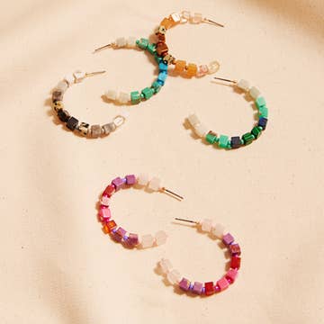 Add a pop of color to your everyday look with our Gem Gradient Hoop earrings. Featuring 15 vibrant gemstones on each hoop, available in 5 color ways, these boho chic hoops are the perfect accessory for a playful and fun style. Shine bright with these pretty gems! ⬩4mm Round Faceted shape Gemstone ⬩Hoop-style Hypoallergenic Brass wire ⬩1.5-inch Hoop earring ⬩Available in Aquamarine (blue), Fluorite (purple/green), and Rose Quartz/Carnelian (Pink/Coral), Moss Agate, & Garnet This item is Handmade This item will ship with gemstone information on the Santore Jewelry Card included with purchase